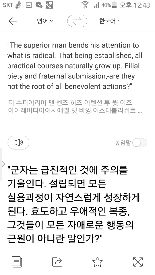 * 나이들어 하는 공부가 재밌다. 특히 학창 시절에는 재미없었던 영어 공부가 새삼 재밌다. <논어> 구절의 영문을 복사해서 번역프로그램이 PAPAGO에 붙여서 결과를 읽고 단어와 구문을 공부할 수 있다.