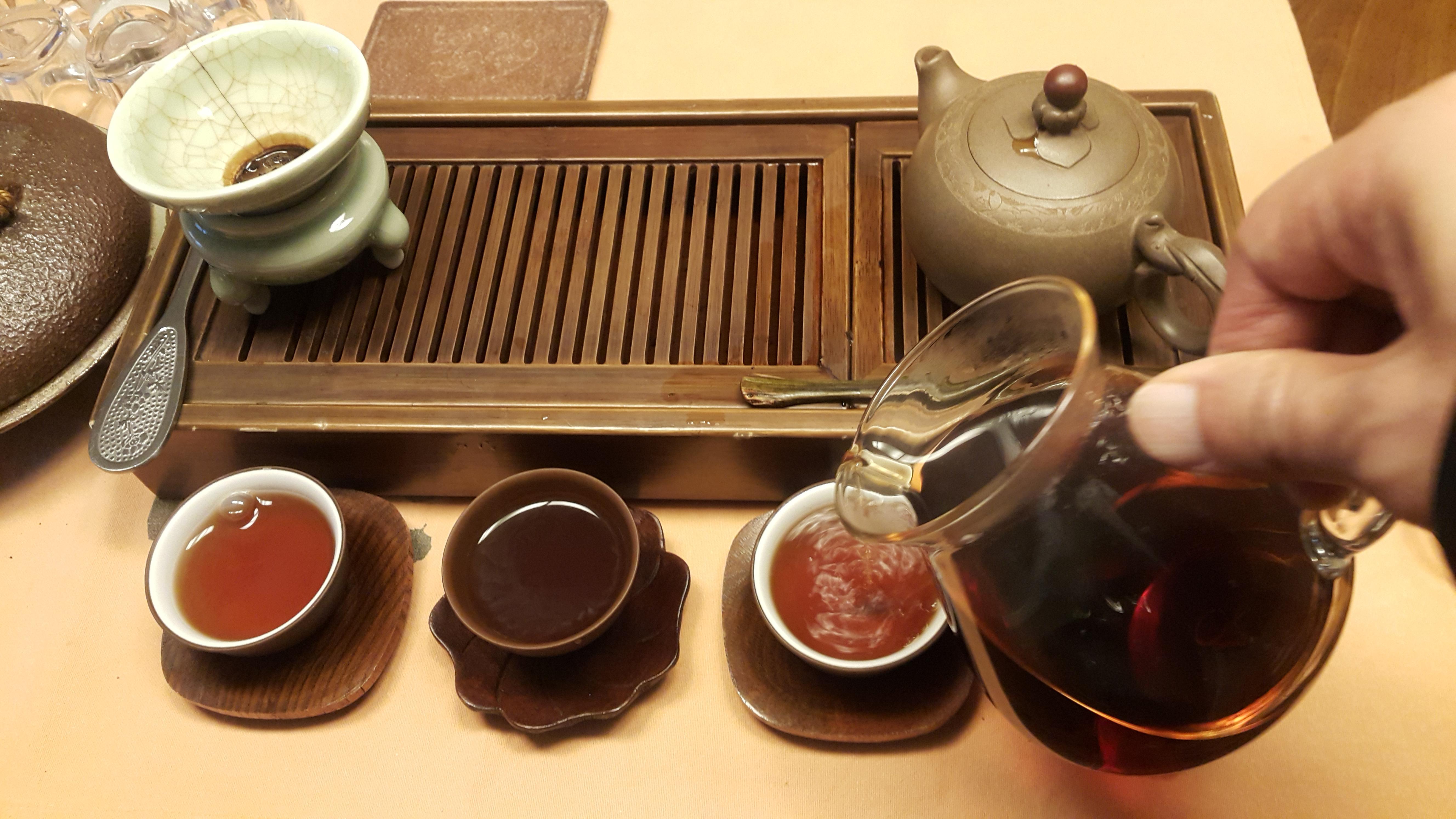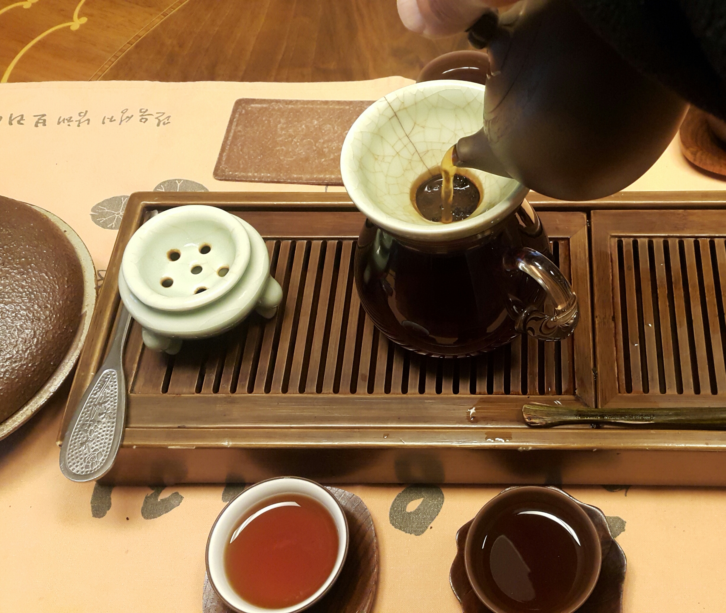 다부, 차호에서 우려낸 차를 공도배(다완)는 걸름망을 통해 깨끗하게 담아서 자녀들인 찻잔에 따른다. 공도배(公道杯)는 차의 농도를 고르게 하에 모든 찻잔에 공평하게 나눈다. 자식들을 두루 사랑하는 어머니 모습 그대로이다.