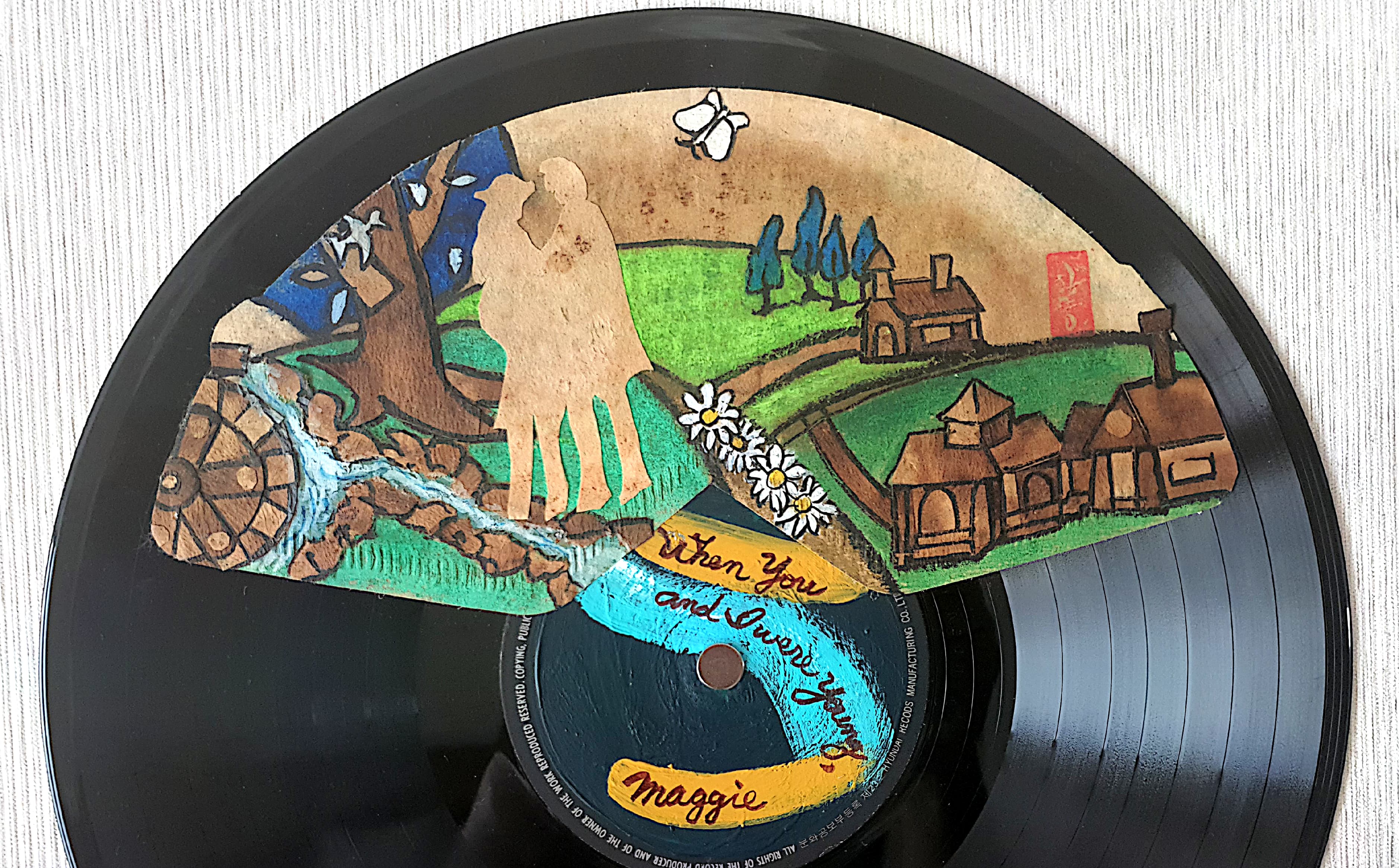 노래의 사연을 커피여과지에 그려보았다. 오른쪽의 저택은 부농의 딸인 매기네 집이다. 언덕 너머 보이는 작은 건물은 노래의 주인공인 매기가 다니는 시골 학교이다. 매기와 노래의 화자는 동네 언덕에 있는 낡은 물방아간을 자주 찾아 사랑을 언약하였다. 물방아간 동산에는 데이지 꽃이 만발하다. 반세기가 지나 백발이 다 된 화자는 신혼의 아름다움을 그대로 간직하고 떠난 매기의 영혼과 함께을 추억의 언덕을 찾아온다.