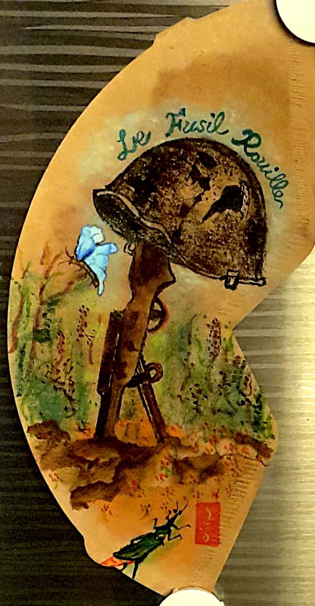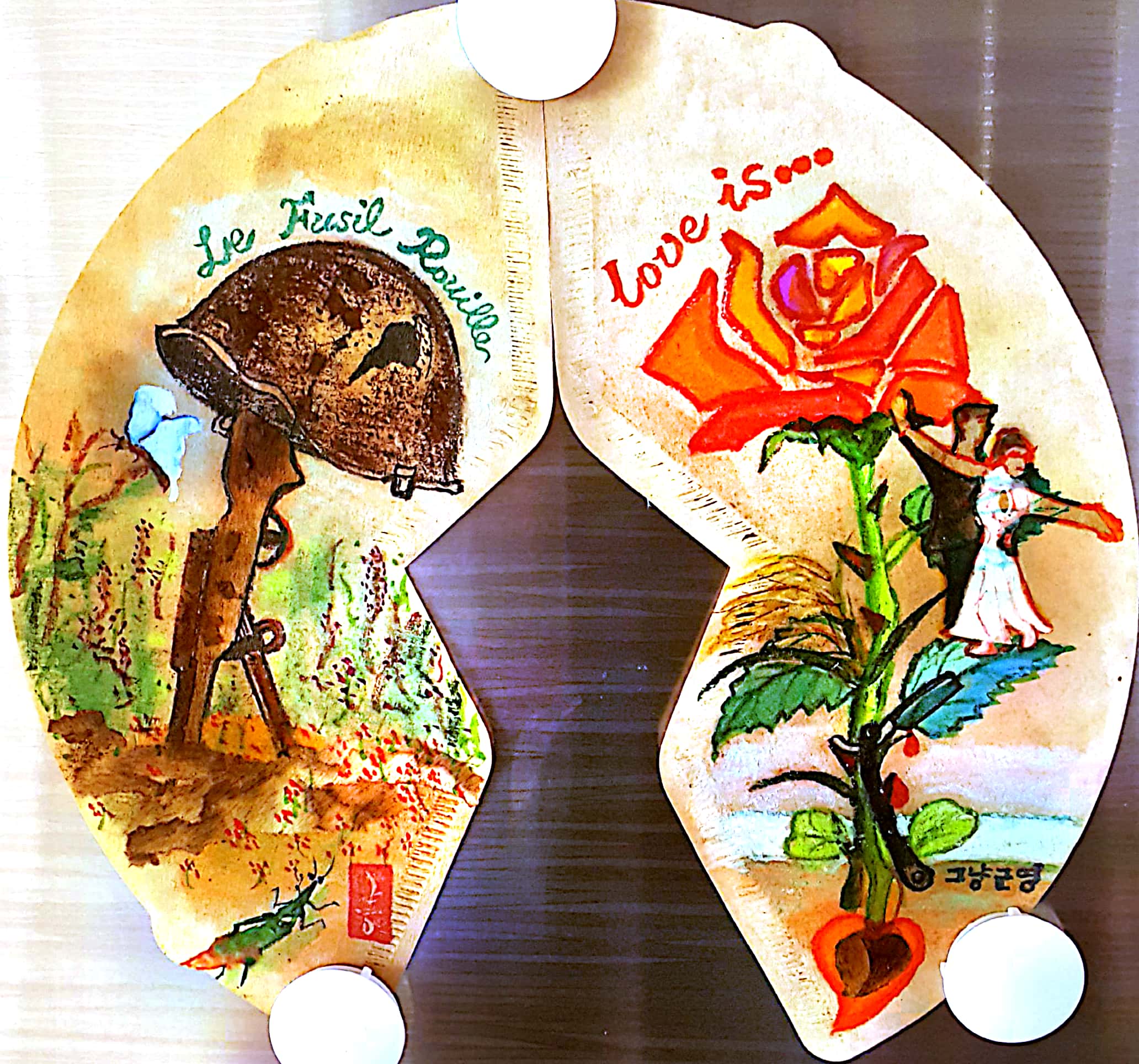 어울리는 짝그림이 있으면 좋겠다 생각 끝에 '녹슨 총' 노래를 그렸다. 모습은 전혀 어울리지 않지만 사랑의 짝인 평화의 메세지를 전하기에 가장 적합하겠다는 의미를 붙인다.