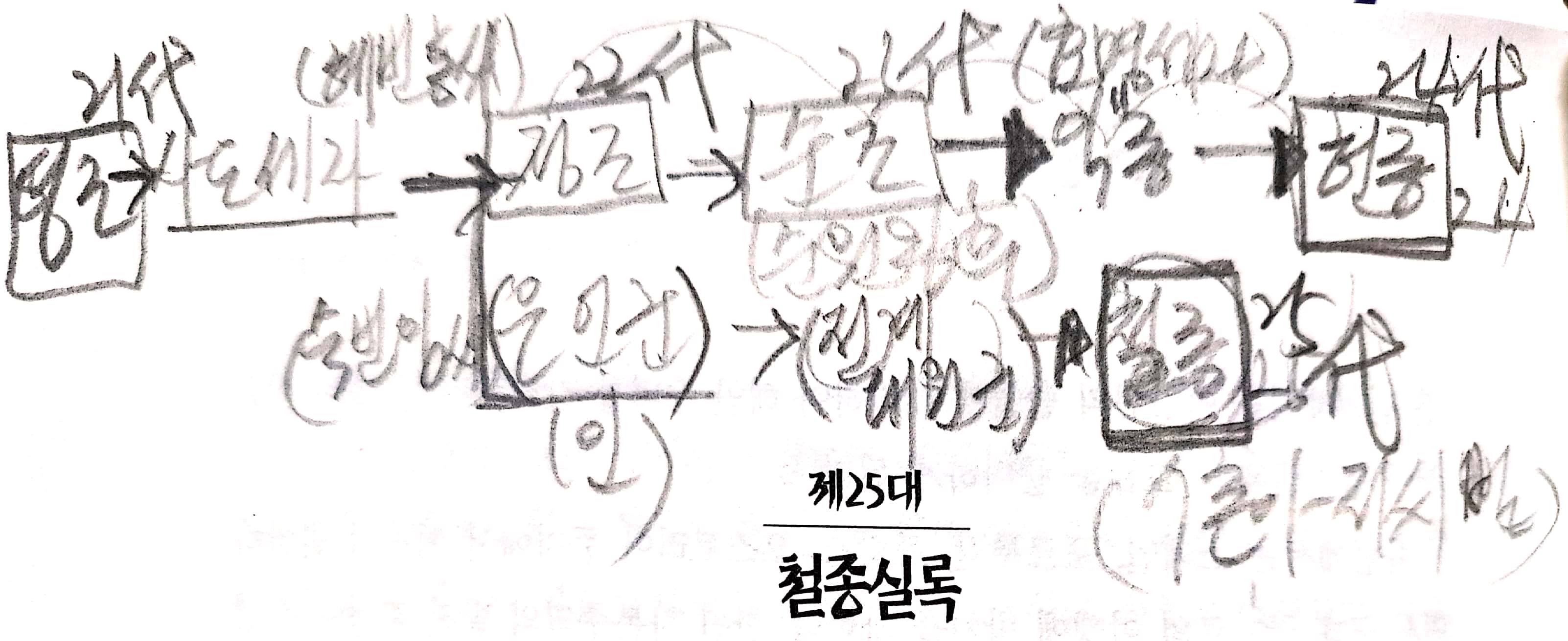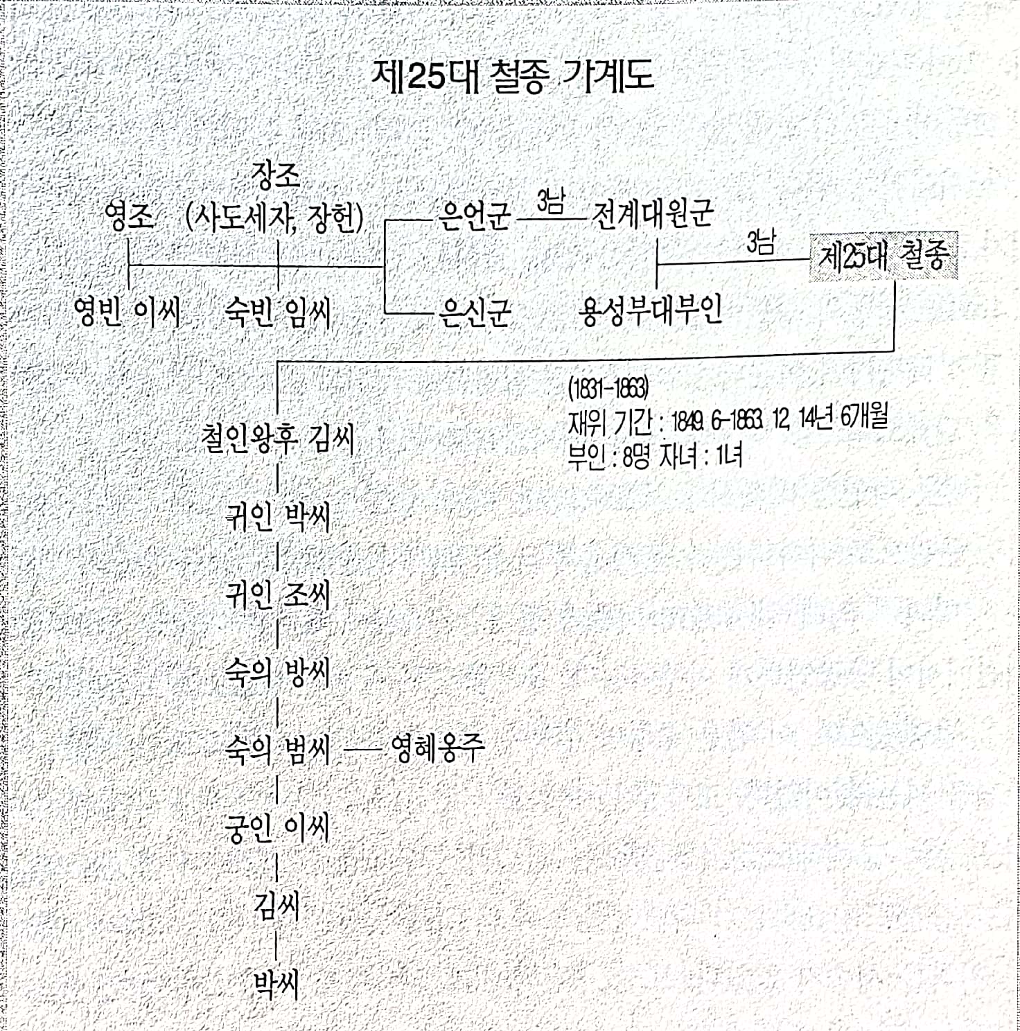 후대의 왕은 본래 항렬로 따진다면 동생이나 조카벌이 왕통을 잇게 한다. 왜냐하면 종묘에서 선왕에게 제사 드릴 때에 항렬 높은 이가 낮은 이에게 제사를 올리는 법도는 안되기 때문이다. 그런데 안동 김씨 척족들의 세도 권력 유지 차원에서 선왕 헌종의 7촌 아저씨벌이 되는 강화도령 원범을 왕통을 잇게 했다. 원범은 천애고아가 되어 강화도에서 나무를 하고 농사를 짓는 농사꾼으로 살던 중 5년여가 지난 어느날 갑자기 왕이 되었다. 순원왕후 김씨의 명이었다. 나이도 어린 데다 배운 것도 없다보니 대왕대비 순원왕후가 수렴 청정을 하였다. 순조 대부터 시작된 안동 김씨의 세도 정치는 이때부터 절정을 이루었다.