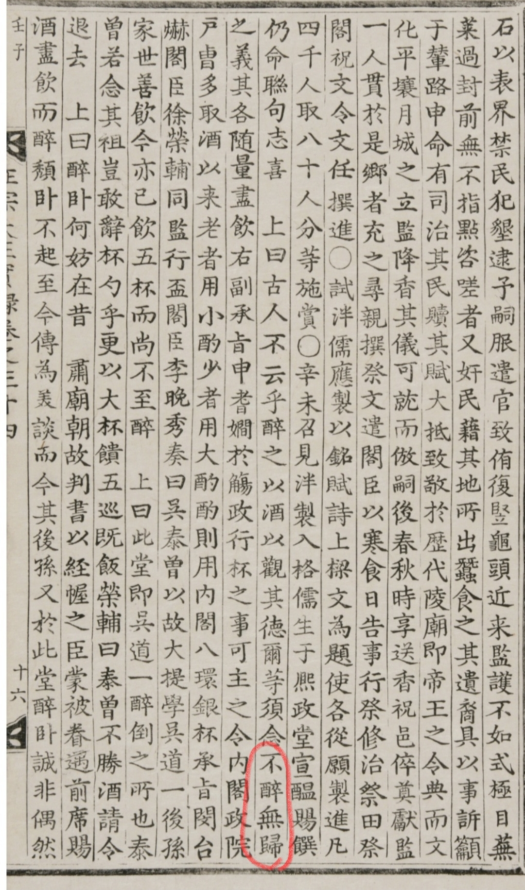 “옛사람의 말에 술로 취하게 하고 그의 덕을 살펴본다(醉之以酒以觀其德)고 하였으니, 너희들은 모름지기 취하지 않으면 돌아가지 않는다(不醉無歸)는 뜻을 생각하고 각자 양껏 마셔라. 우부승지 신기(申耆)는 술좌석에 익숙하니, 잔 돌리는 일을 맡길 만하다. 내각과 정원과 호조로 하여금 술을 많이 가져오게 하고, 노인은 작은 잔을, 젊은이는 큰 잔을 사용하되, 잔은 내각(內閣)의 팔환은배(八環銀盃)를 사용토록 하라. 승지 민태혁(閔台爀)과 각신 서영보(徐榮輔)가 함께 술잔 돌리는 것을 감독하라.” 하였다.