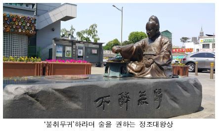 수원화성 팔달문에서 지동시장으로 가는 거리에 정조대왕이 앉아 계신다. 주안상을 펼치고 술을 따르며, "불취무귀(不醉無歸)-취하지 않으면 돌아갈 수 없다"며 명을 내리신다. 양껏 마시라는 뜻이겠다. 임금께서 즐거워 먼저 취기가 오르듯 하다. <조선왕조실록> 정조실록에 나오는 장면이다.