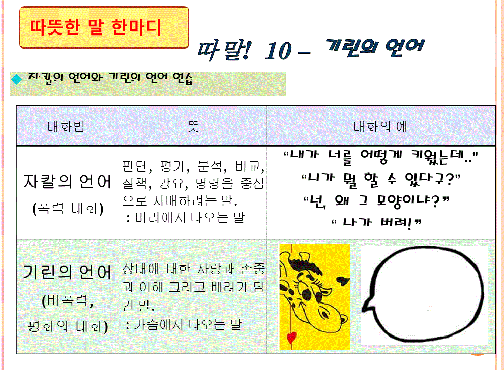 강요ㆍ명령ㆍ질책하며 남의 마음을 해치는 말을 '자칼의 언어'라 한다면, 이해ㆍ존중ㆍ사랑으로 남의 마음을 헤아리는 말을 '기린의 언어'라 한다. 따뜻한 말 한마디는 사람을 살릴 수도 있다. 공자님께서 말씀하신 '부드러운 말 - 손언(巽言)'이 바로 '기린의 언어'이다.