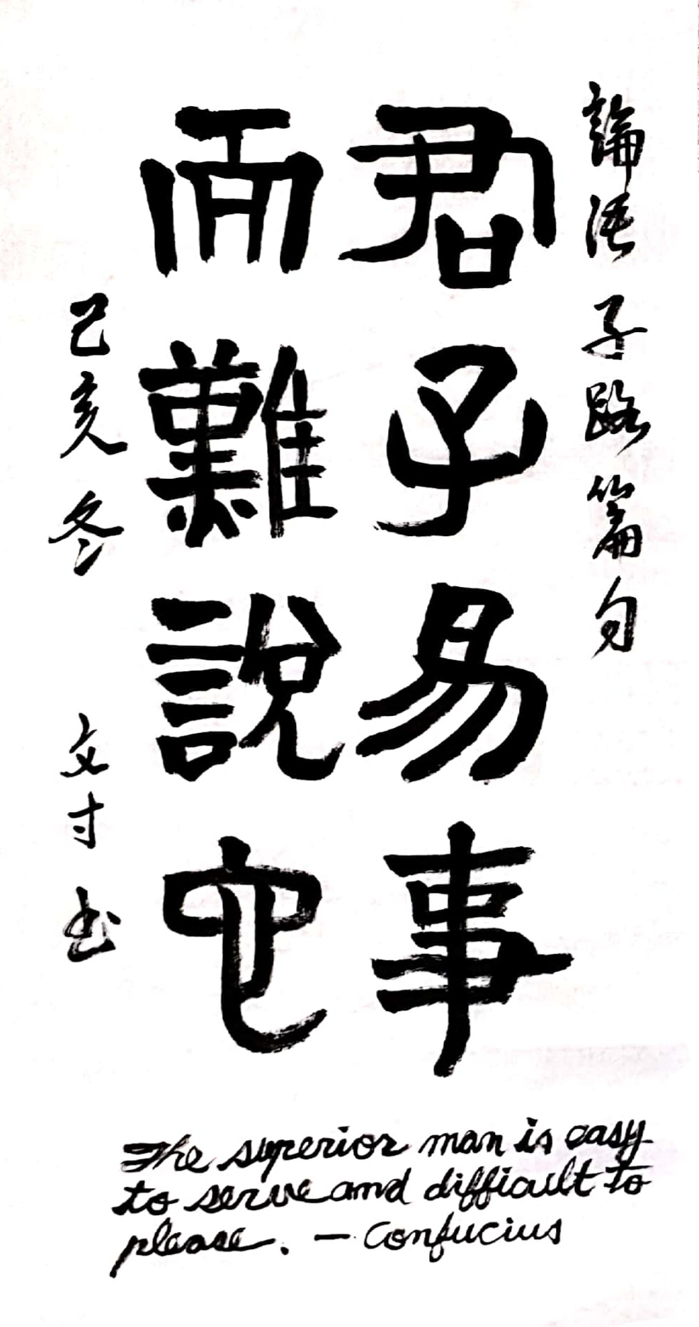 "군자는 섬기기는 쉬워도 기쁘게 하기는 어렵다. 기쁘게 하기를 道로서 하지 않으면 기뻐하지 않으며, 사람을 부림에 있어서는 그릇*에 맞게 한다."