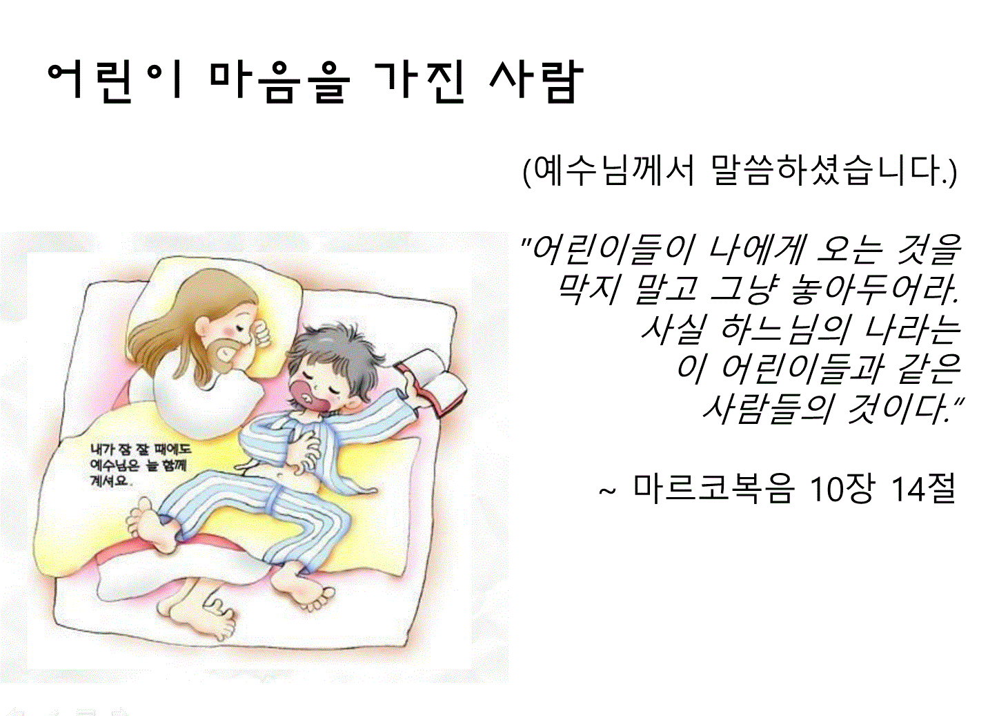 "어린이들이 나에게 오는 것을 막지 말고 그냥 놓아두어라. 사실 하느님의 나라는 이 어린이들과 같은 사람들의 것이다." ~ 마르코복음 10장 14절