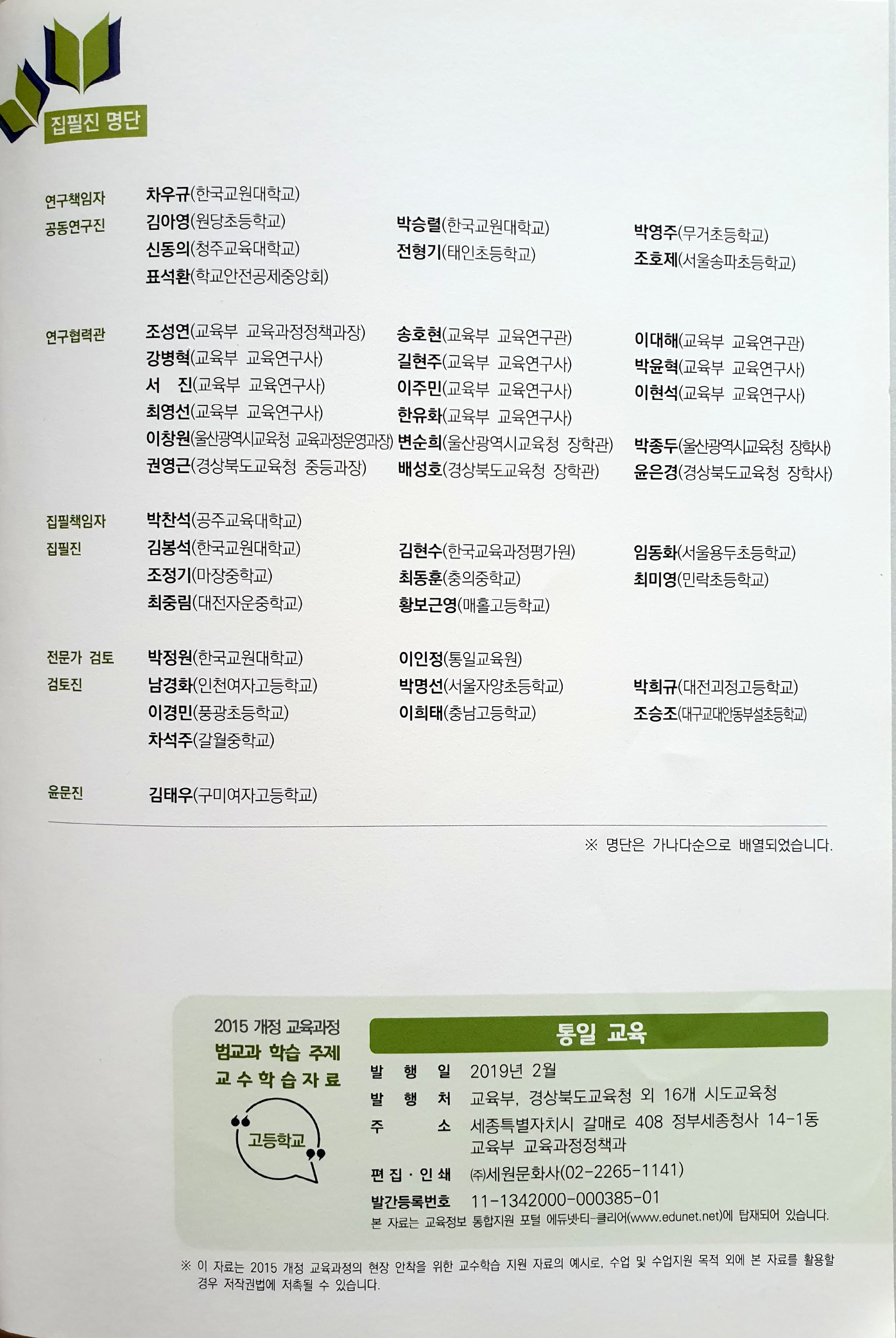 2019 교육과정 연계한 통일교육(고등학교용) 집필