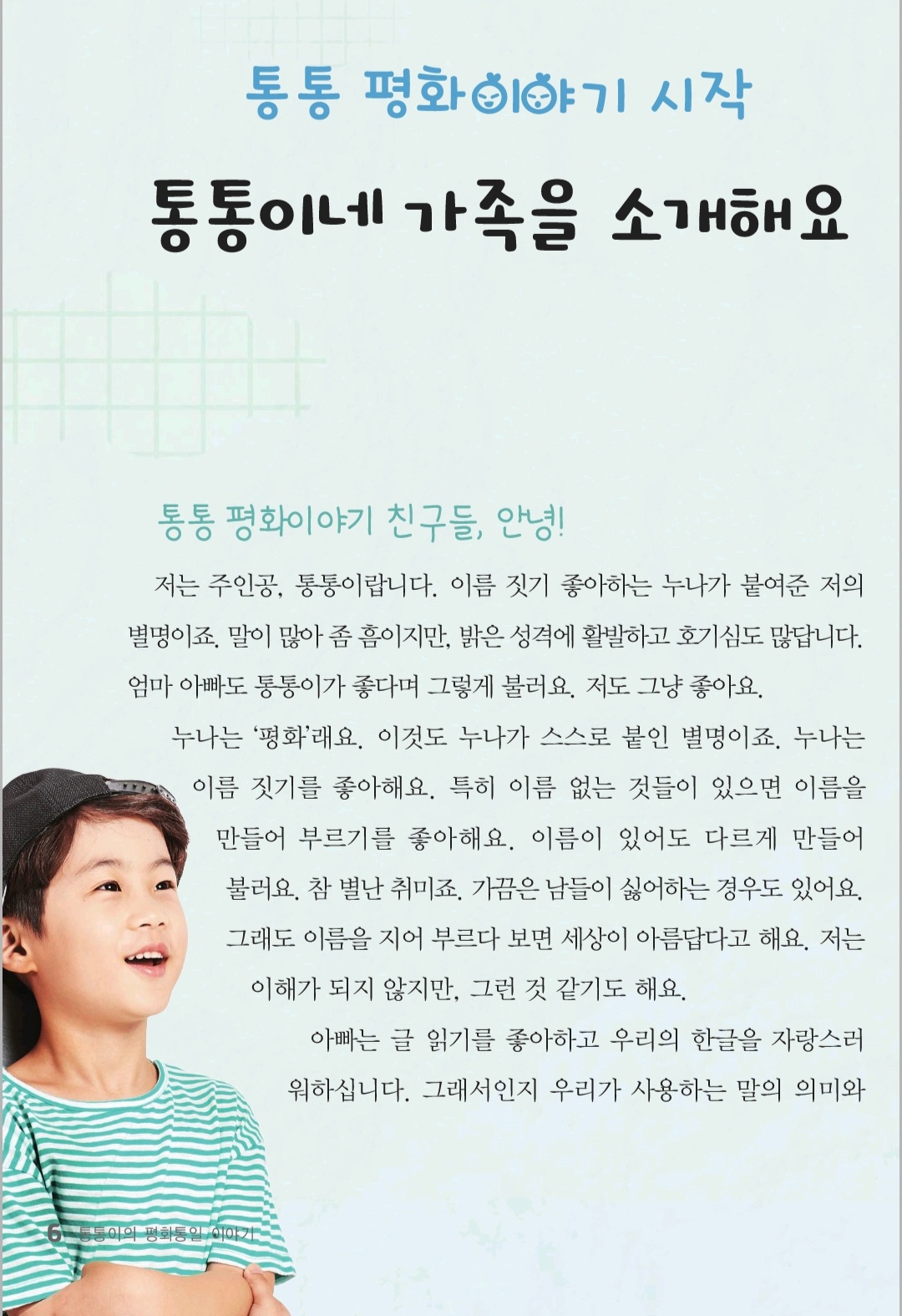 육하원칙(5W1H)으로 장 제목을 잡고, 주인공 통통이와 누나(평화)가 중심이 되어 가족이 함께 풀어가는 이야기 거리를 소재로 삼아 엮어 갔습니다.