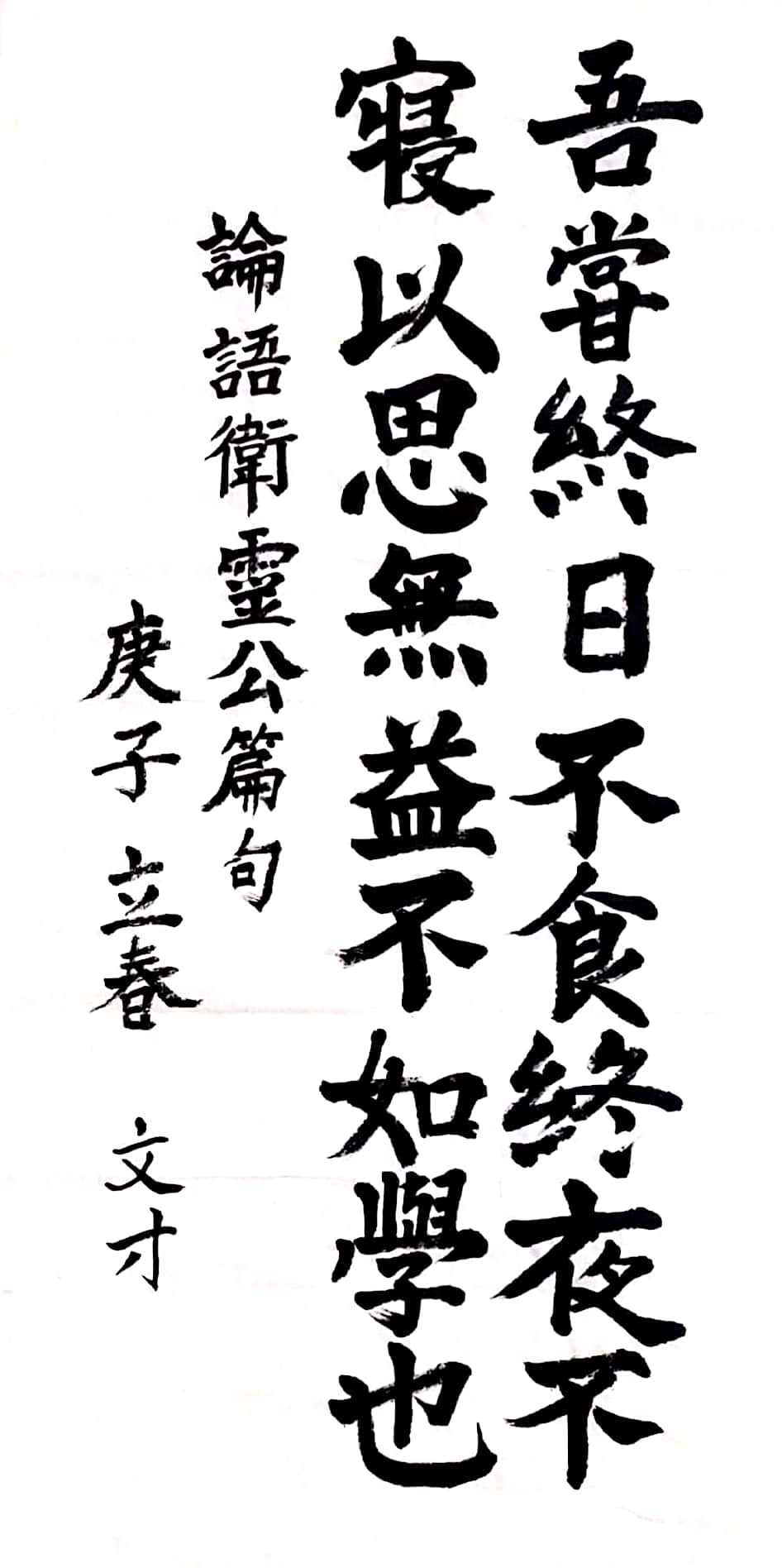 공자께서 말씀하셨다. "내 일찌기 종일토록 밥을 먹지 않고 밤새도록 잠을 자지 않고서 생각을 해보니 유익함이 없더라. 배우는 것만 못하였다."