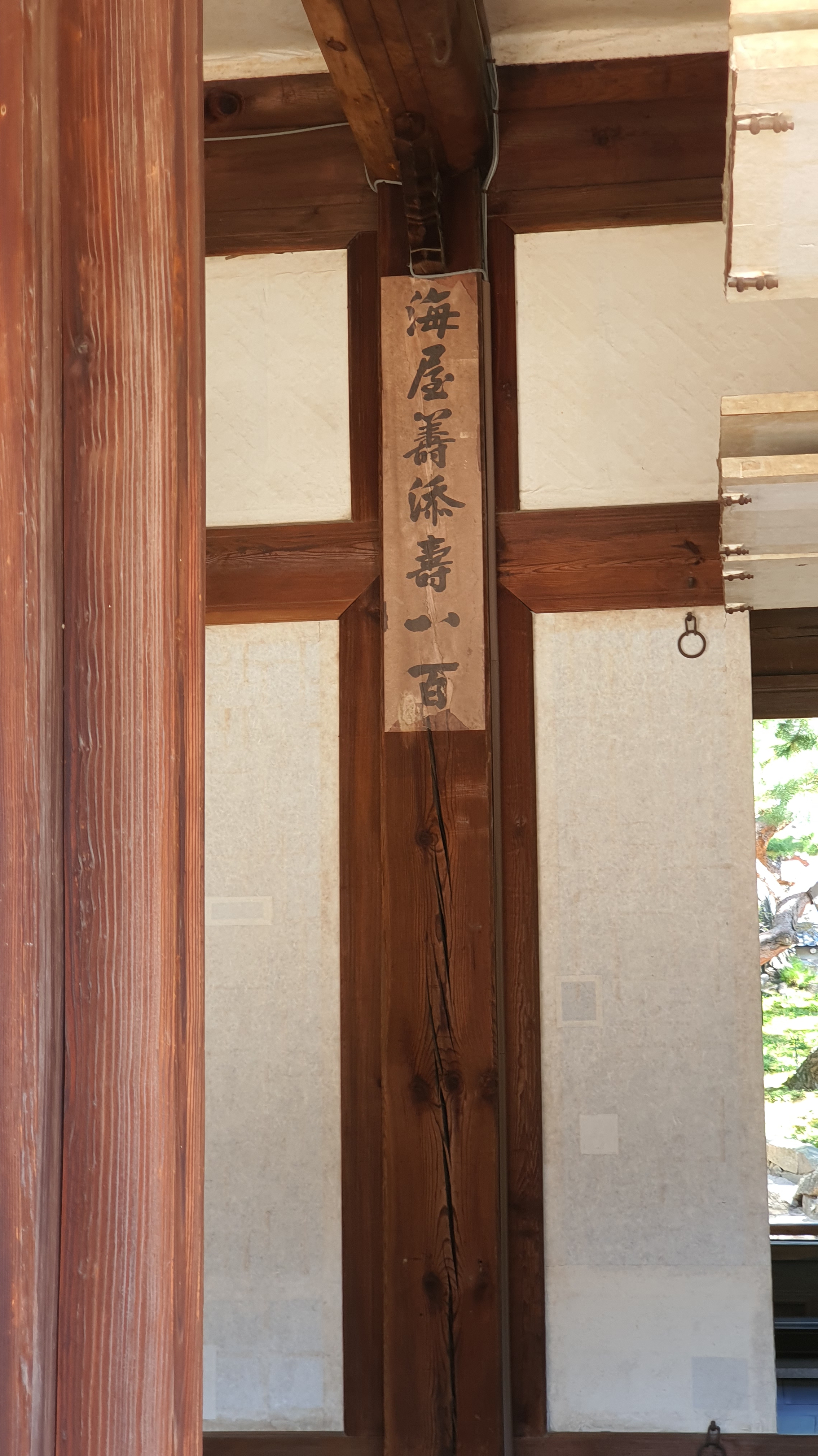 제작 정보 : 석어당 주련은 보통의 주련처럼 나무 판에 새긴 것이 아니라 종이에 글씨를 써 그대로 기둥에 발라 놓은 것이다.