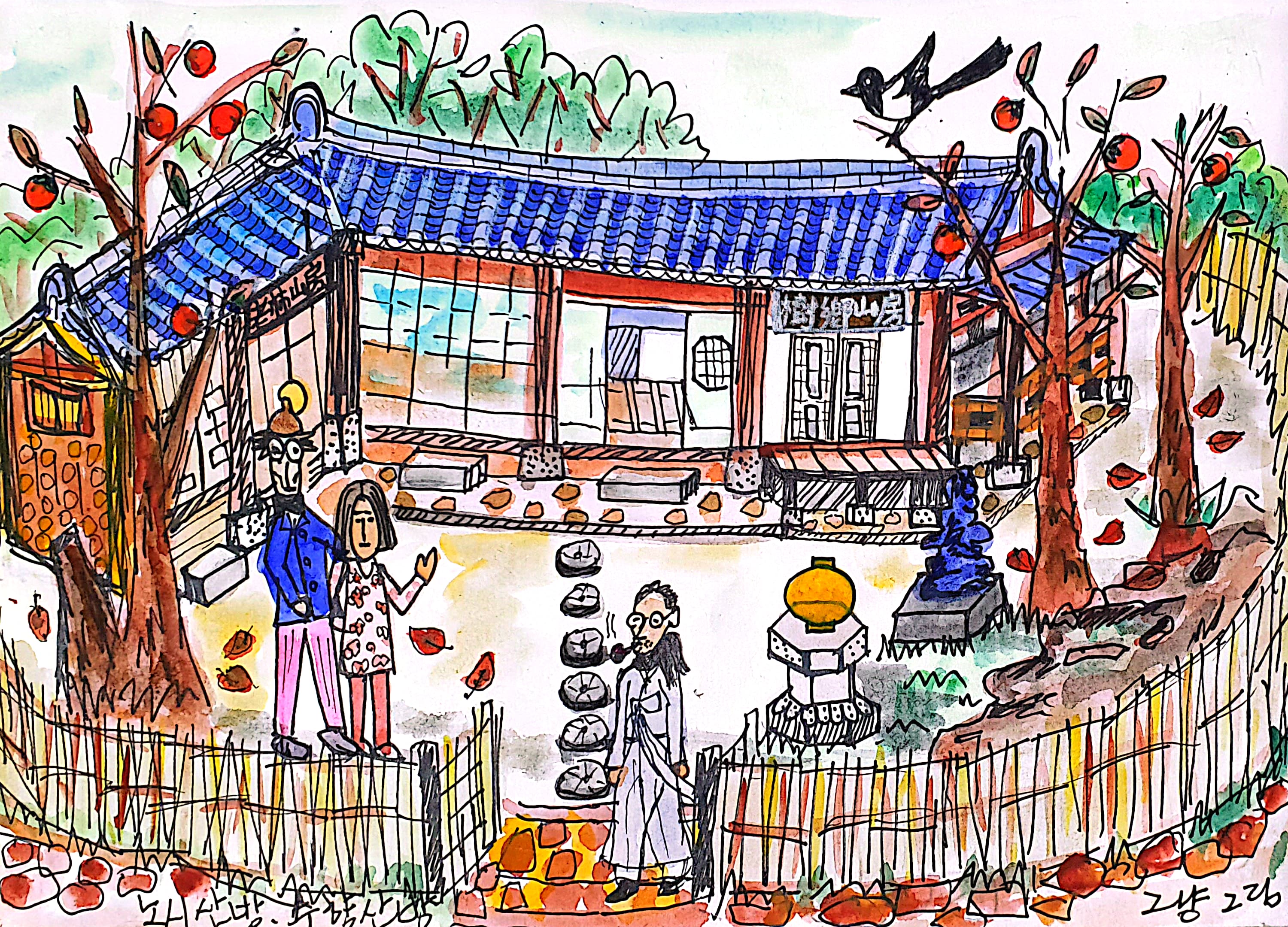 수화 김환기와 향안 변동림이 노시산방 옛 주인이었던 김용준을 배웅하고 있다. 노시산방의 새 주인은 수향산방으로 현판하였다. 늙은 나무의 감은 다 익어가고 날은 차다.
