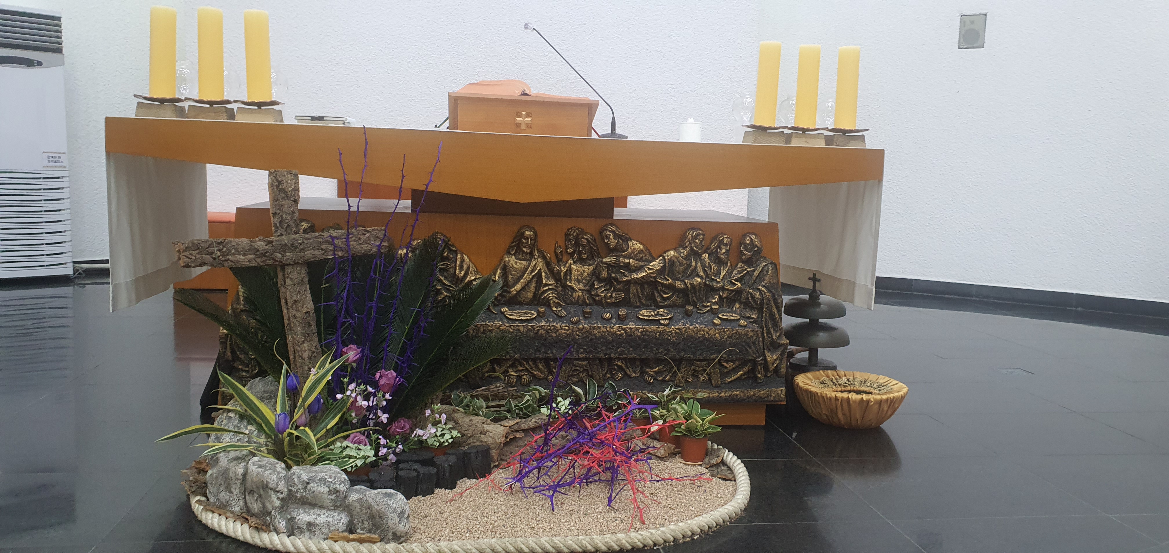 성당 제대 앞은 성당에서 가장 중요하고 성스런 곳이다. 가장 높이 가운데에는 십자가가 있고, 그 아래 제대가 있으며, 그 왼쪽에 성체를 모신 감실과 설교단이, 오른쪽에 성모상이 있다.