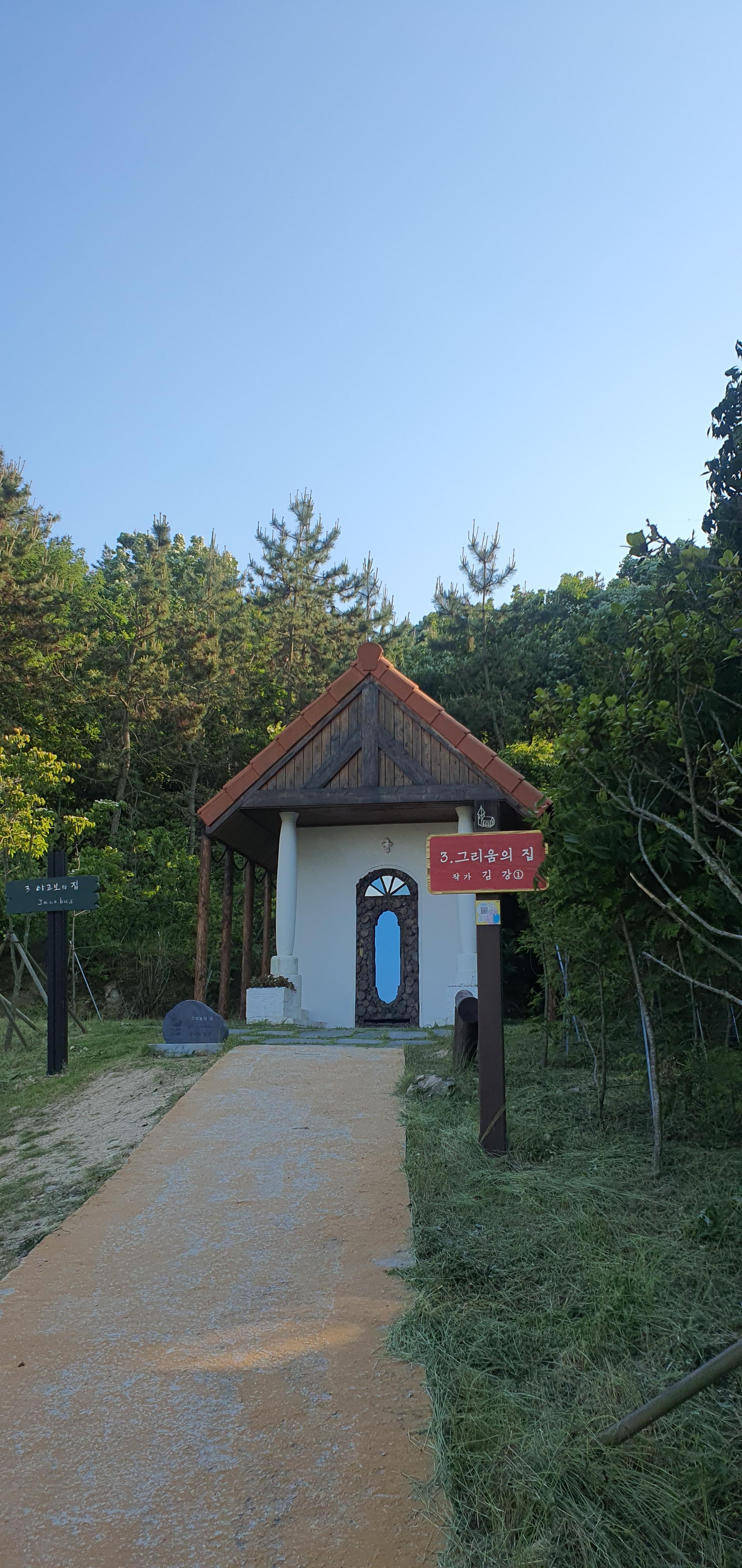 위치 ▶ 대기점도 큰 연못 지나 숲 근처논길을 따라 걷다보면 숲 입구에 보이는 작은 예배당. 심플한 디자인에 붉은기와, 나무기둥을 양쪽에 세워 안정감이 돋보인다.