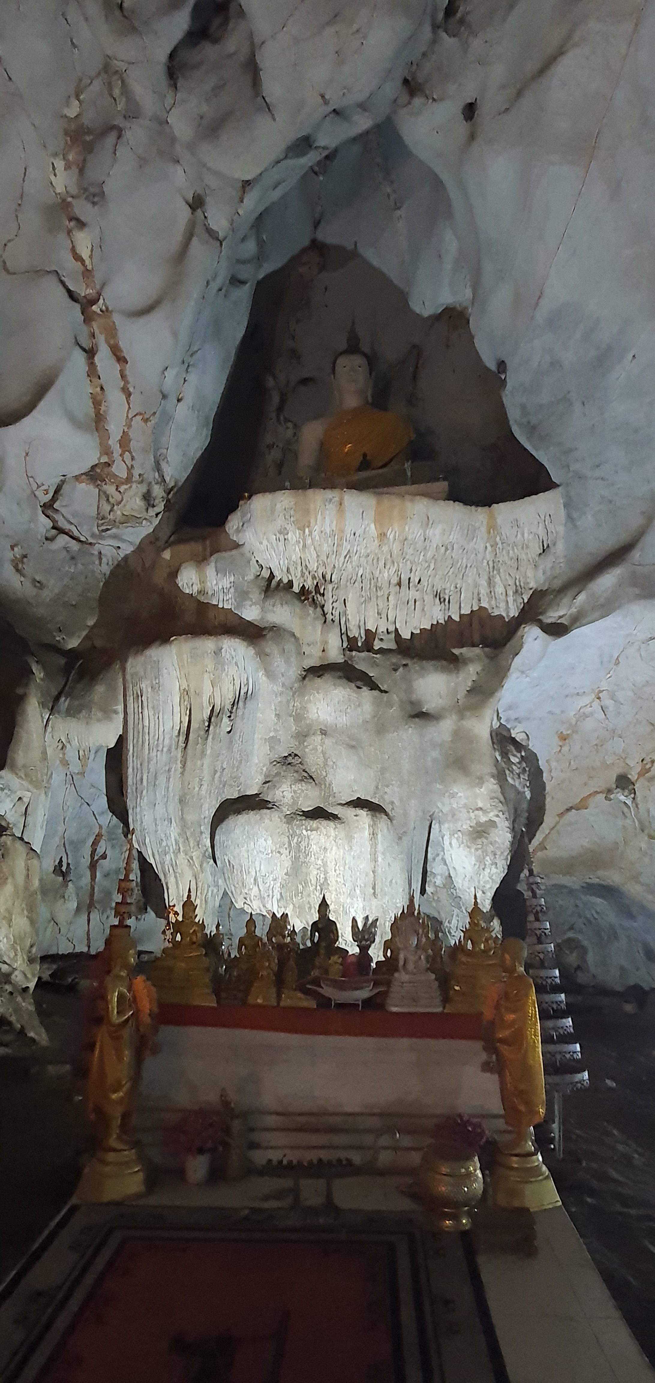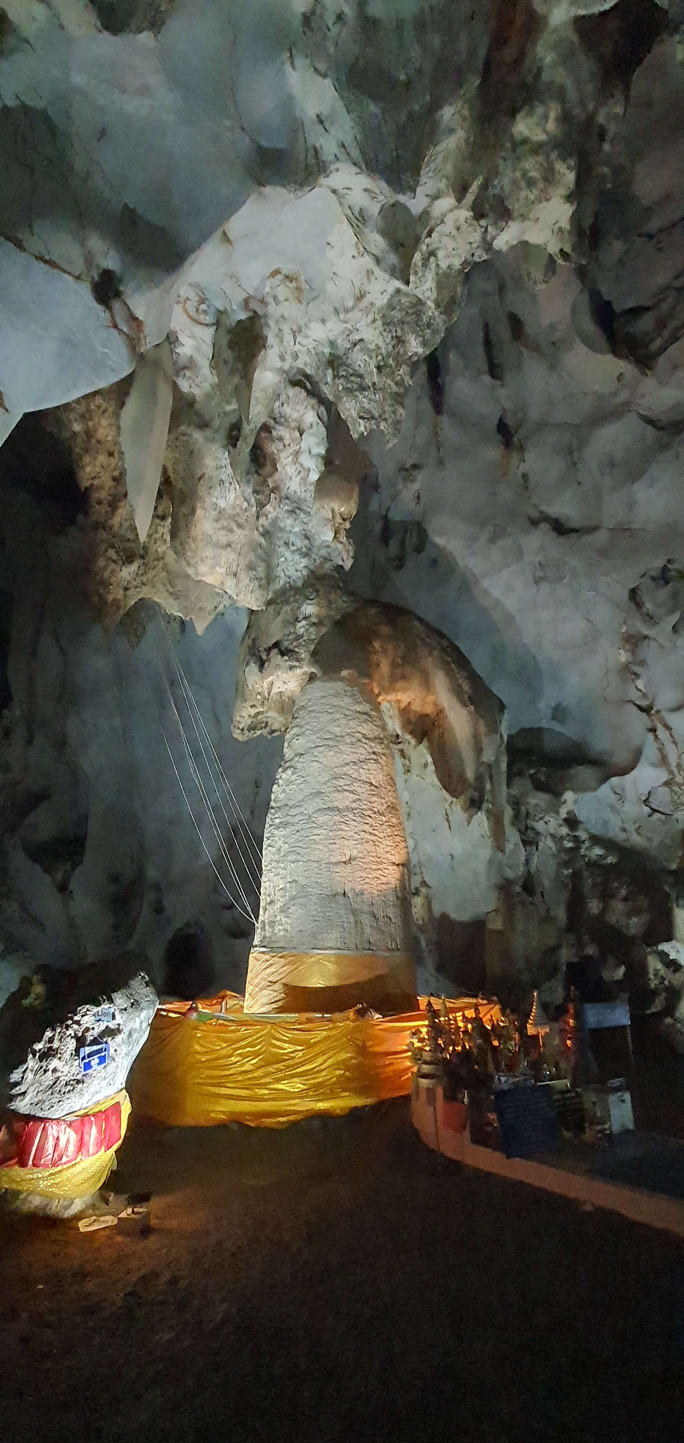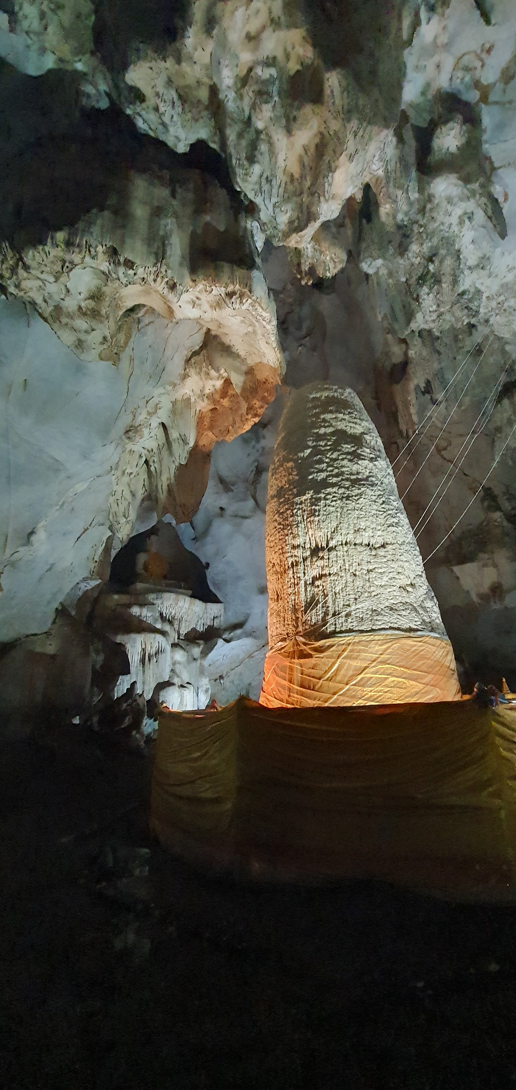전혀 상상하지 못했던 넓은 공간에서 좌불 와불 등 여러 부처님이 계신다. 금비단을 두른 거대한 석순도 경배의 대상이 되어있다.