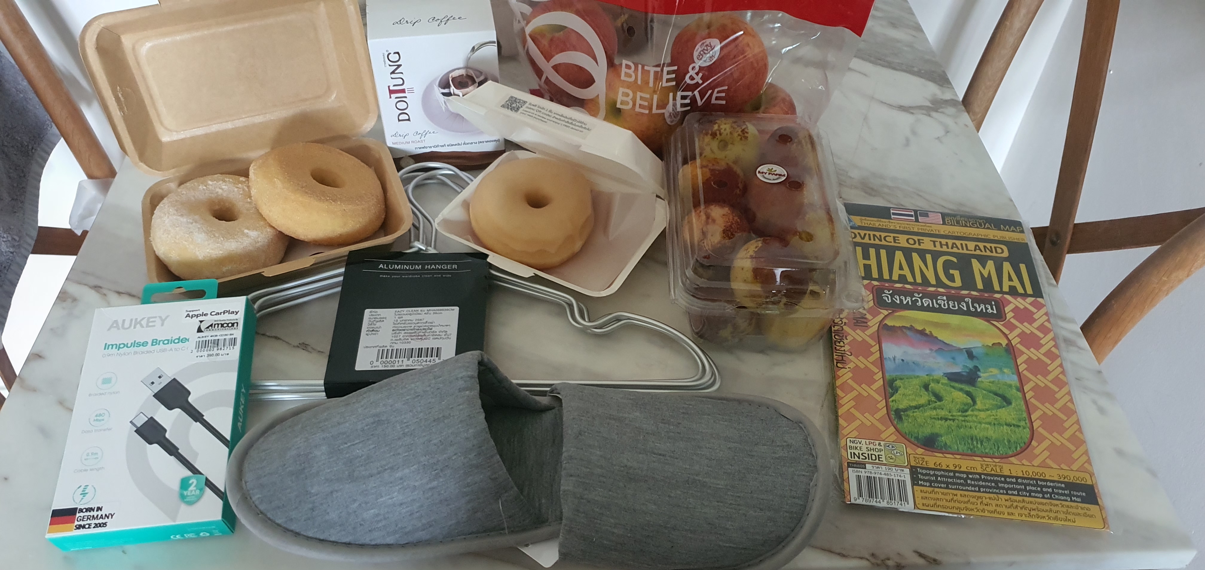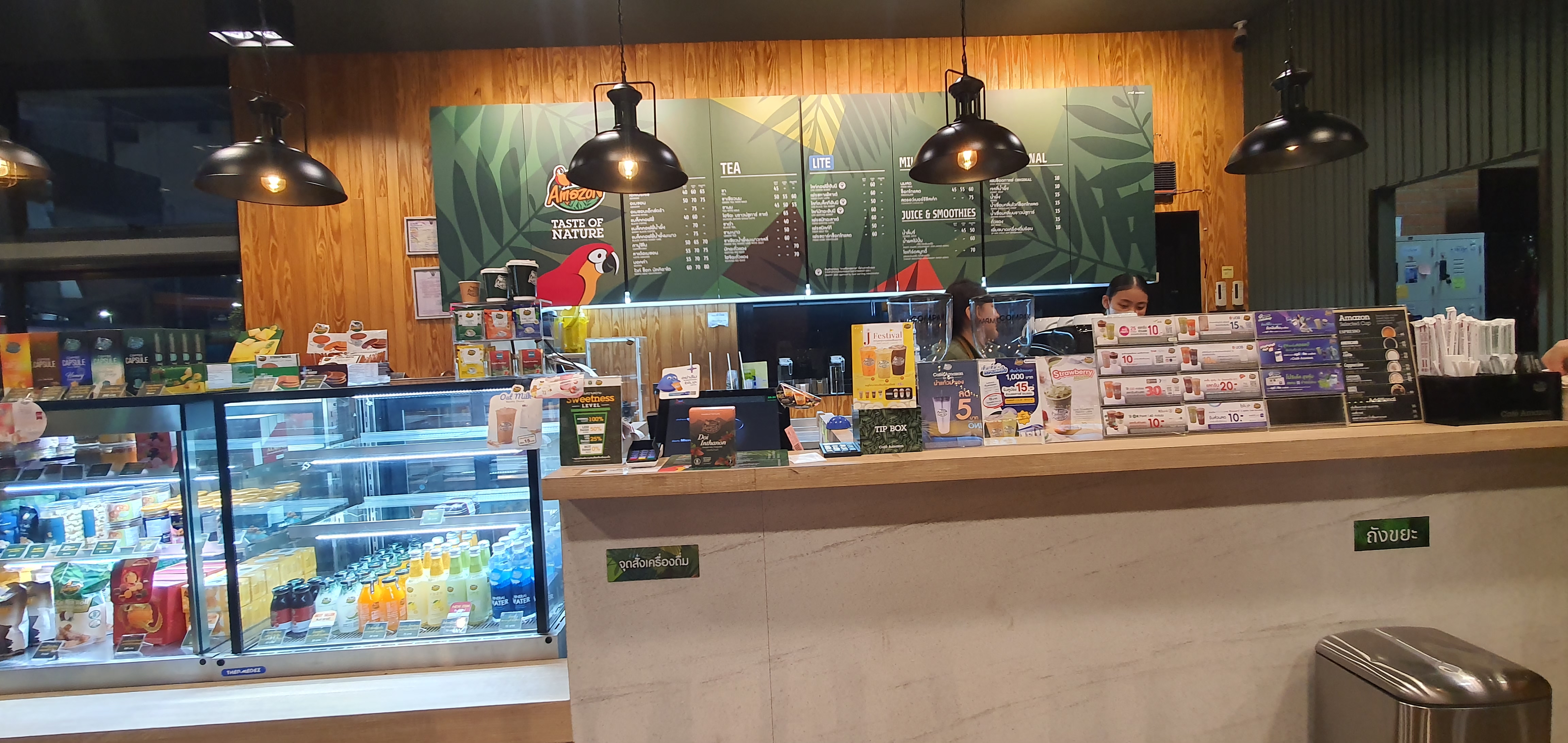혼자 나가서 쇼핑을 해봤다. 태국 바트를 직접 사용해보고 번역기 돌려가며 치앙마이 관광지도 등 이러저런 물건을 사고 거스름돈을 챙겨받았다. 태국돈을 눈 여겨 구분도 해보았다. 저녁은 콘도 바로 옆에 있는 그린타운에서 간단하게 가성비 좋은 일식 해물국수를 먹었다. 한식당 '마당'이 있었지만, 생각보다 많이 비싸다. 아마존 카페의 앵무새 로고와 진녹색이 이쁘다.