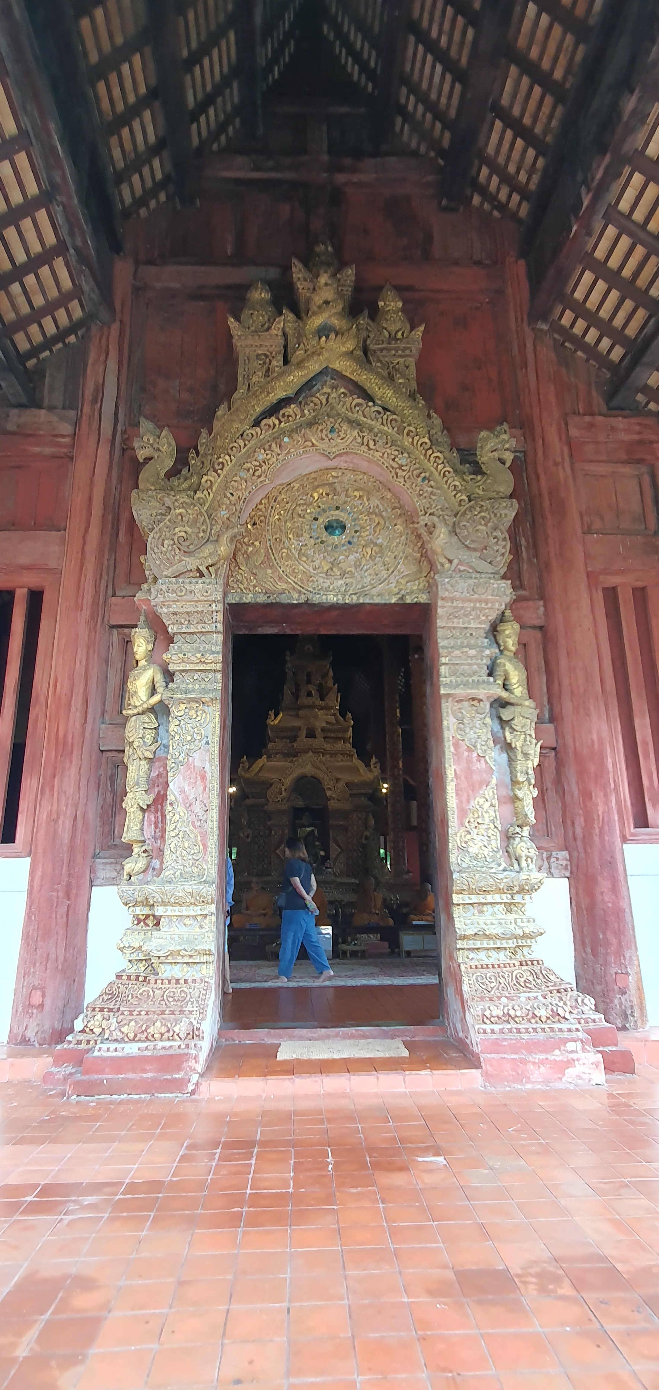 처마 아래의 금박으로 장식된 화려한 박공(pediment)장식에는 힌 두교의 원숭이 장군 하누만 (Hanuman)모양이 장식되어있는 것으로 보아 마치 크메르 사원의 건축 양식의 영향을 받은 것으로 보이지만 과거 란나 지역이 크메르의 영향을 크게 받지 않았다는 점과 마지막 사원의 보수 시기인 1900 년대 초의 태국의 상황으로 본다면 이미 태국의 건국신화인 라 마끼안이 만들어진 것으로 보아 그 원숭이 장군상은 태국 건국 신화의 것으로 보인다. 즉 란나의 건축양식에 태국의 양식을 첨가하여 태국화(化) 시켜놓은