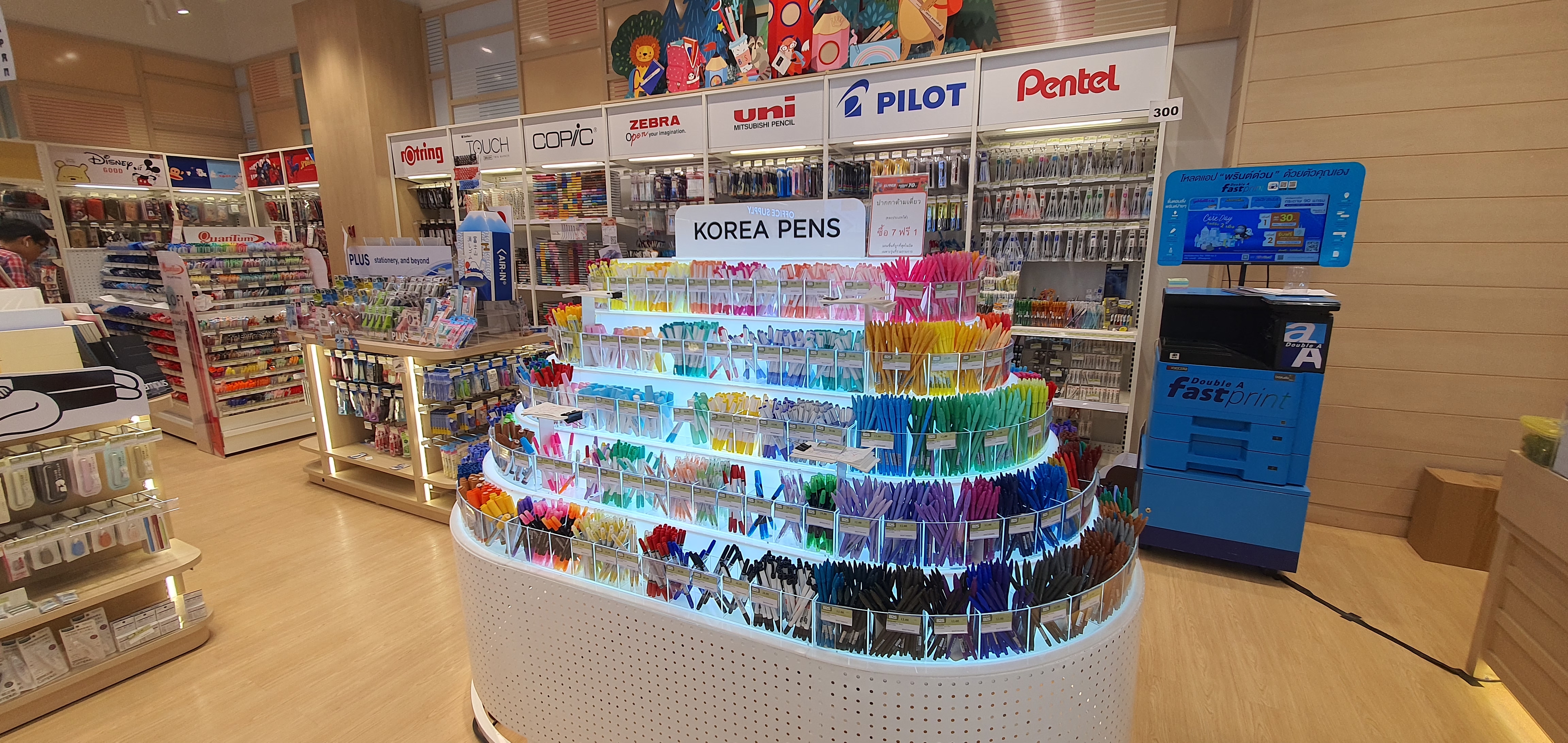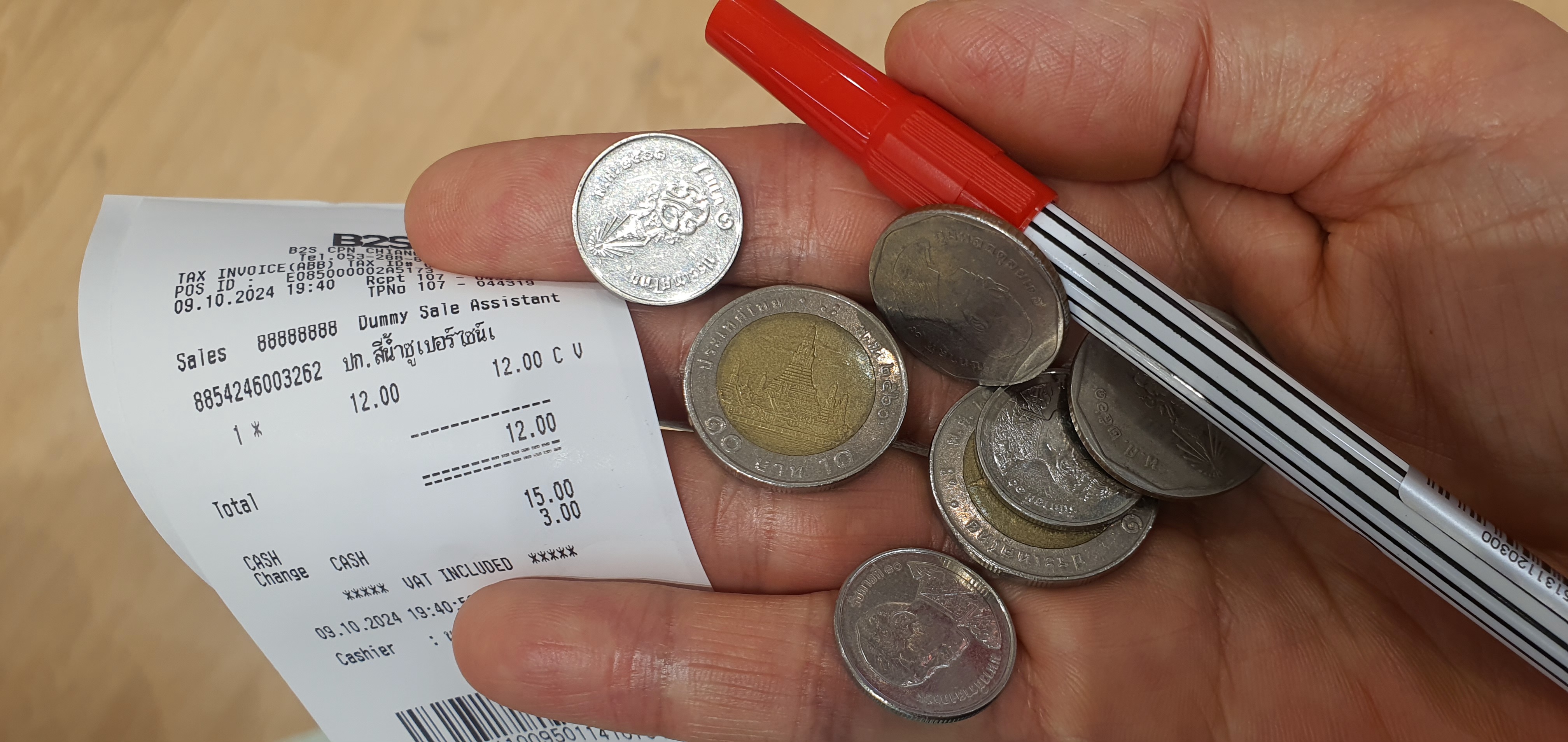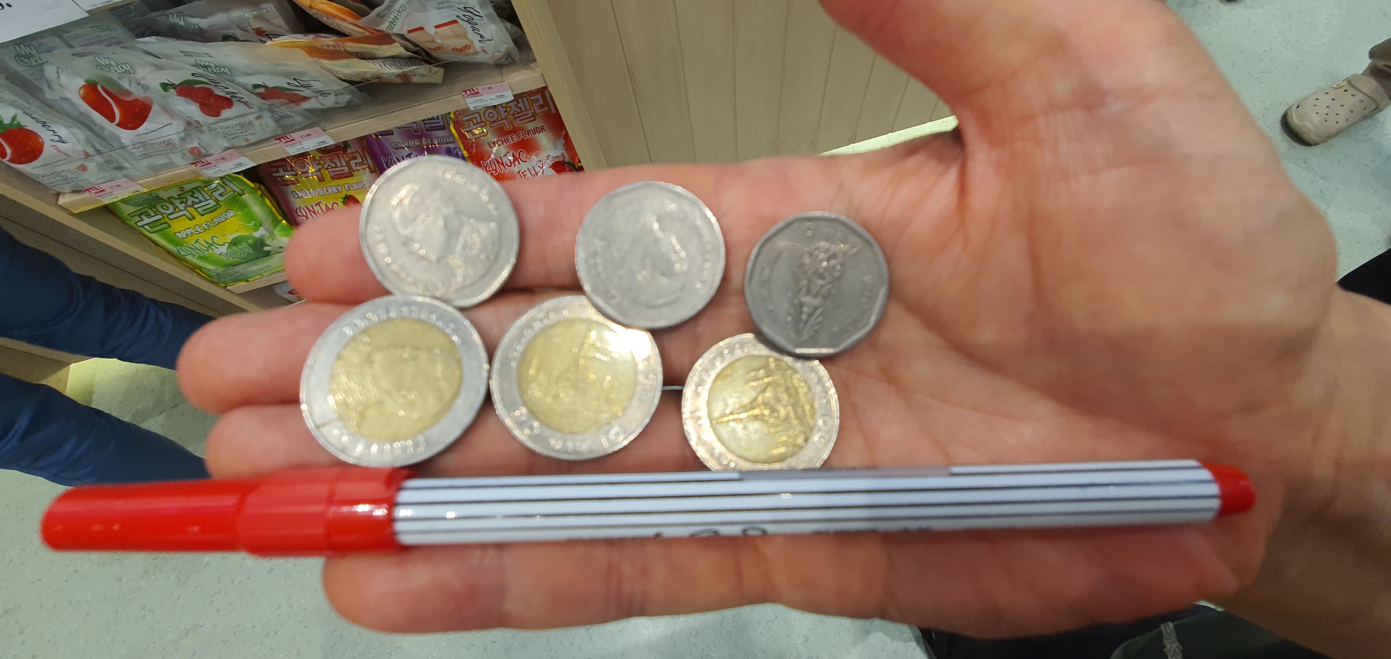 그래서 동전에 손바닥에 펼쳐 보인다. 그러면 종업원이 웃으며 챙겨가고 또 거스럼 동전도 챙겨준다. 한국의 펜 코너가 따로 있다. 친숙한 모나미 붉은 색 싸인펜 하나 샀다. 12바트. 15바트를 가져가서 1바트 3개를 거슬러 줬다.
