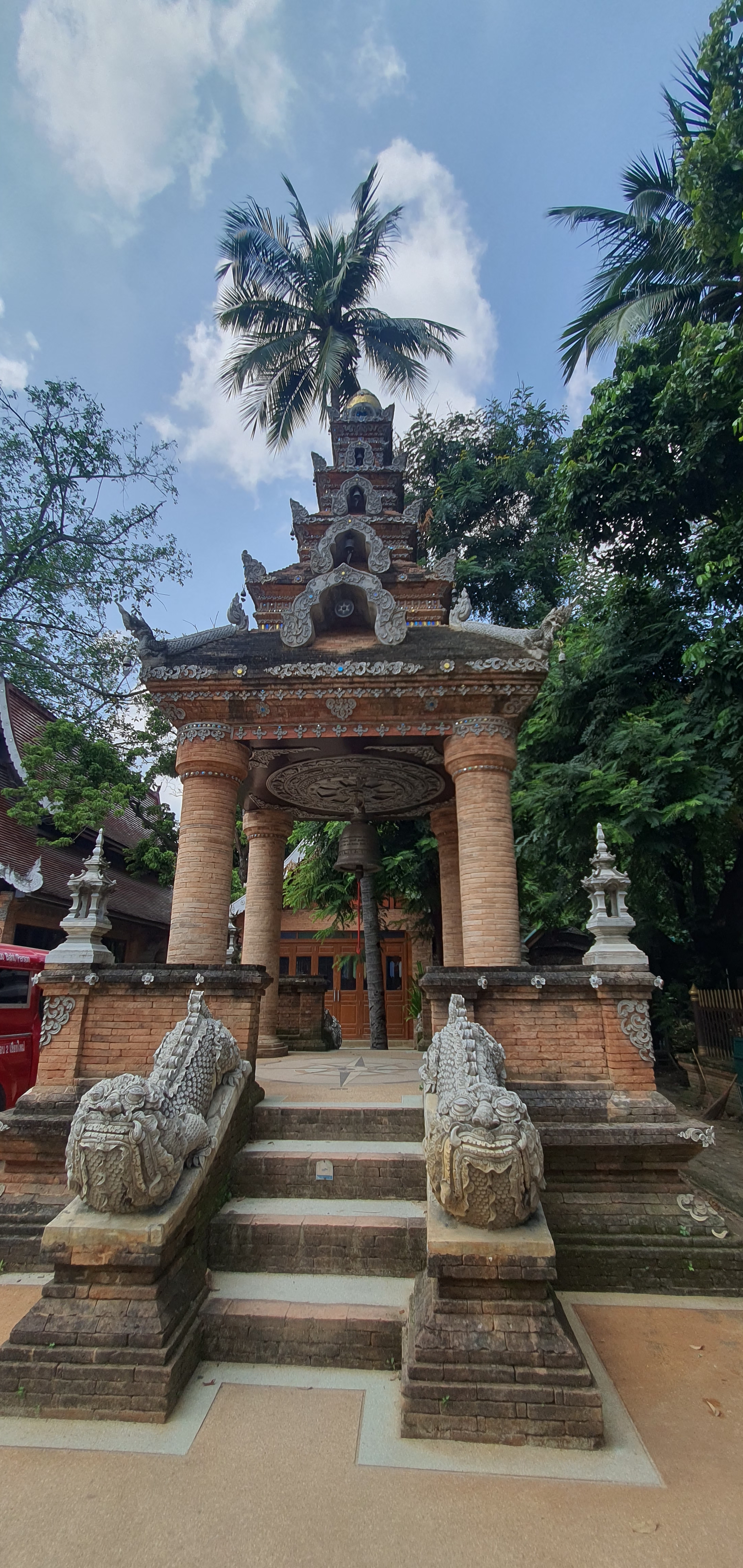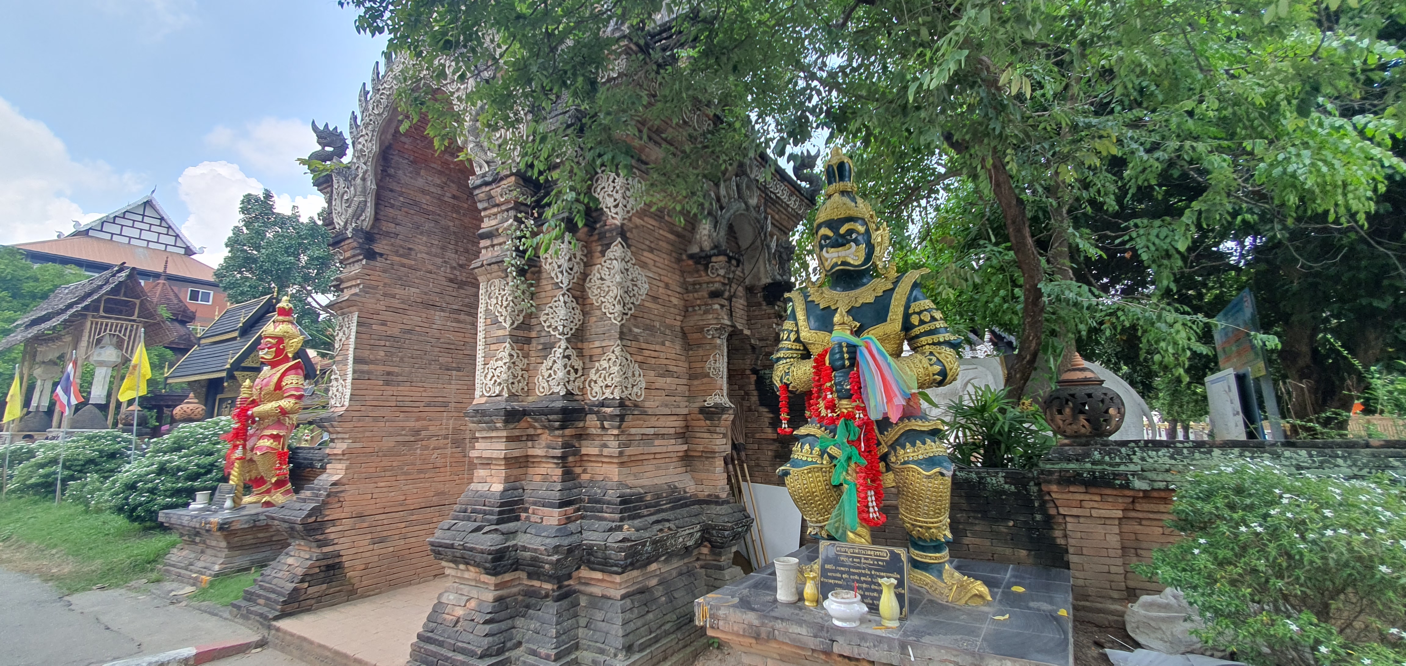 큰 체디의 벽돌은 대부분 옛 그대로 두었다. 이는 치앙마이의 다른 사원의, 종종 최근에, 치장한 체디와 대조된다. 주목할 만한 것은 정교하게 조각된 나가(뱀)와 목조 사원 외관입니다. 사원은 남북 축을 따라 정렬되어 있다. 대부분의 불교 사원은 동쪽, 떠오르는 태양을 향해 있다.