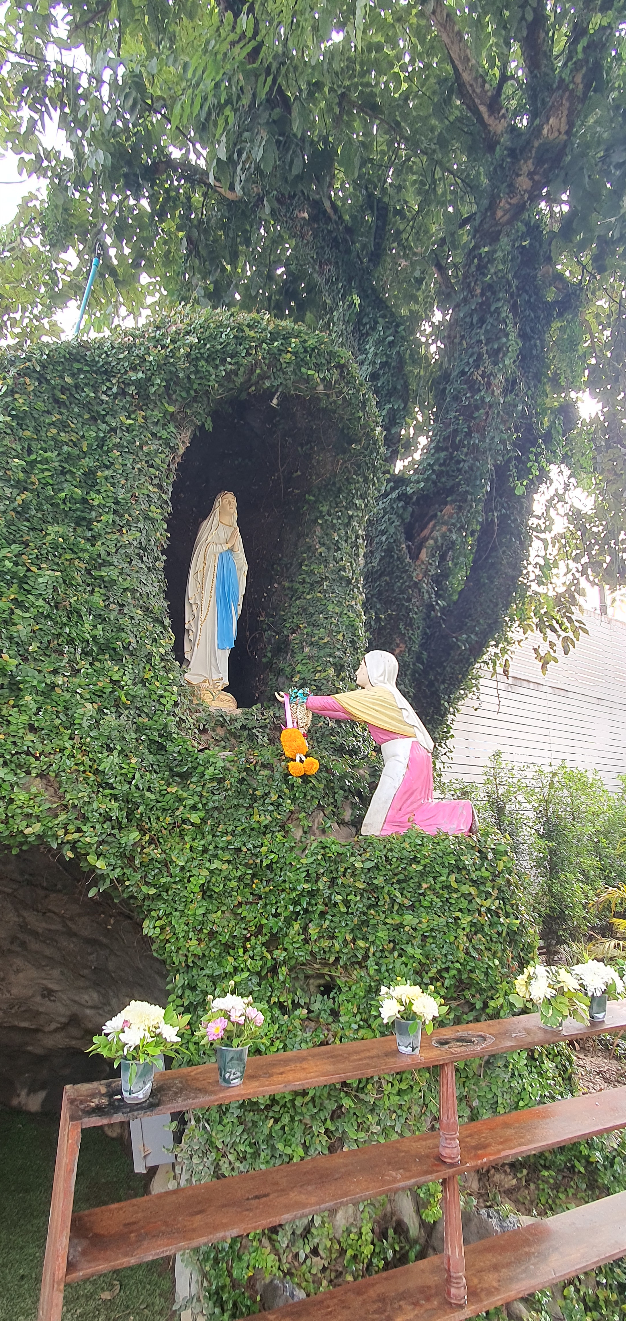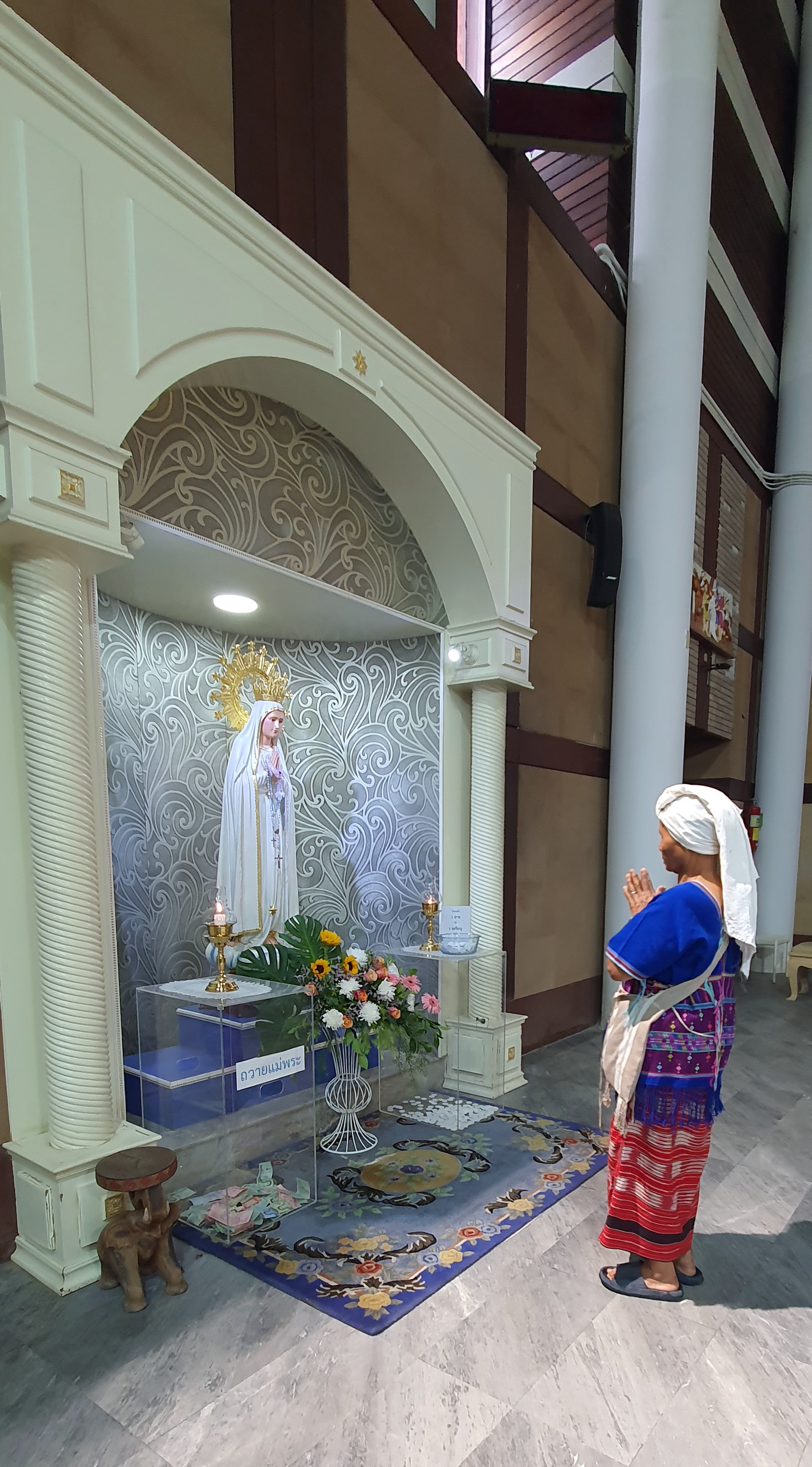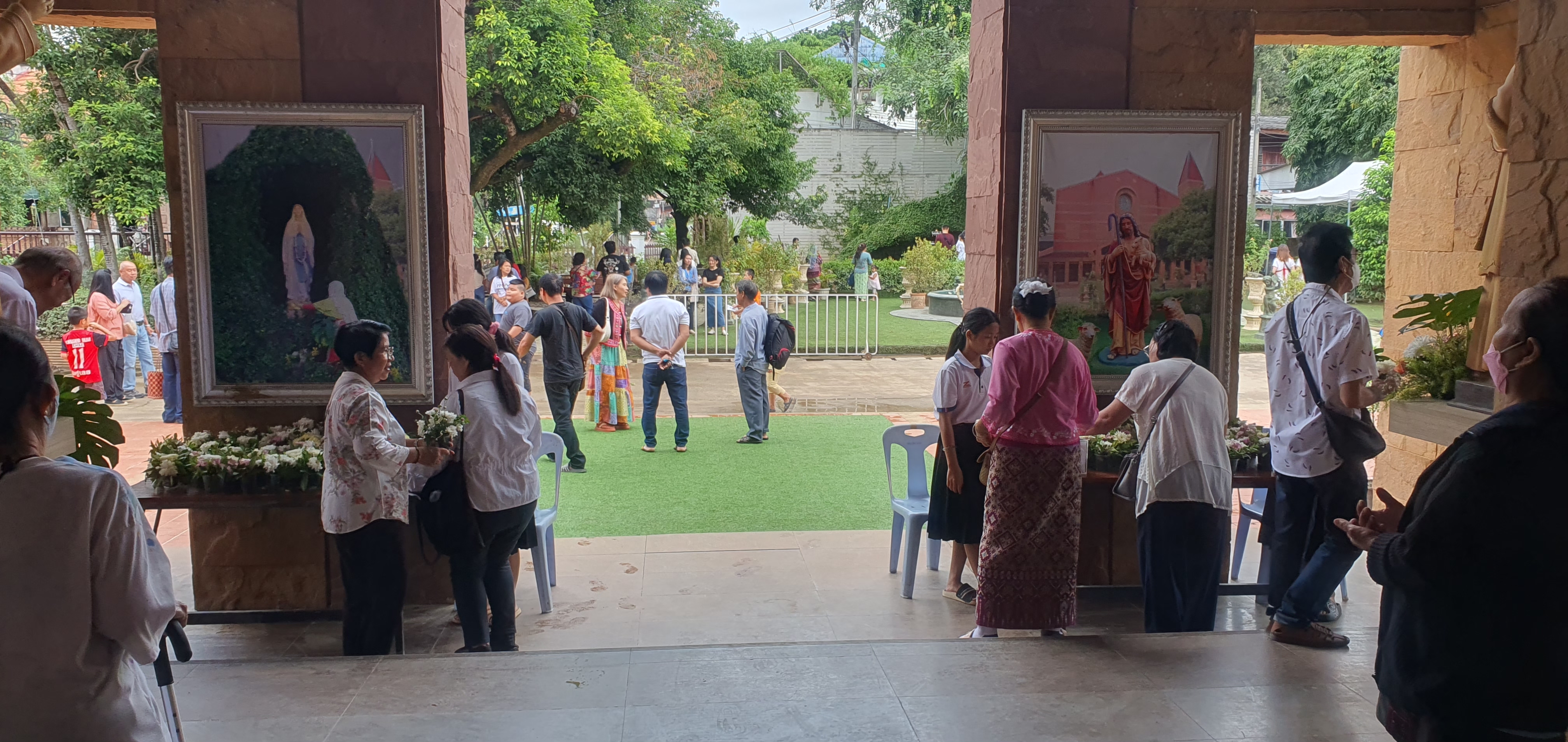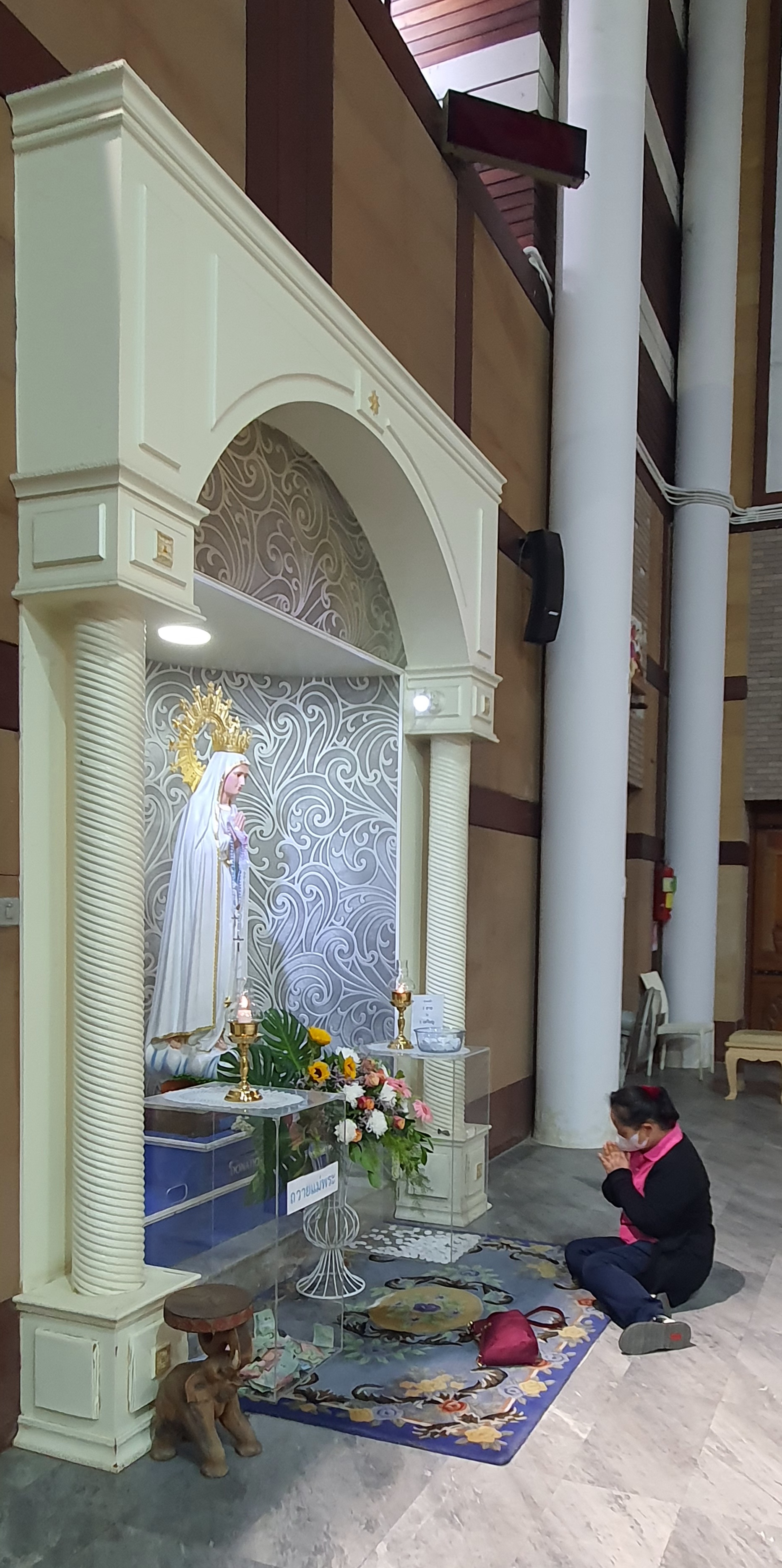 성당입구에서 학생들이 꽃을 팔고 있었다. 성모상에 헌화할 작은 꽃바구니, 20바트 지폐 하나를 기부통에 넣고 성모상에 바치고 기도하고 성당으로 들어간다. 기부금이 너무 작었나 싶어서 100바트 지폐를 한 장 더 넣고, 학생들을 위해서 마음 속으로 기도했다.
