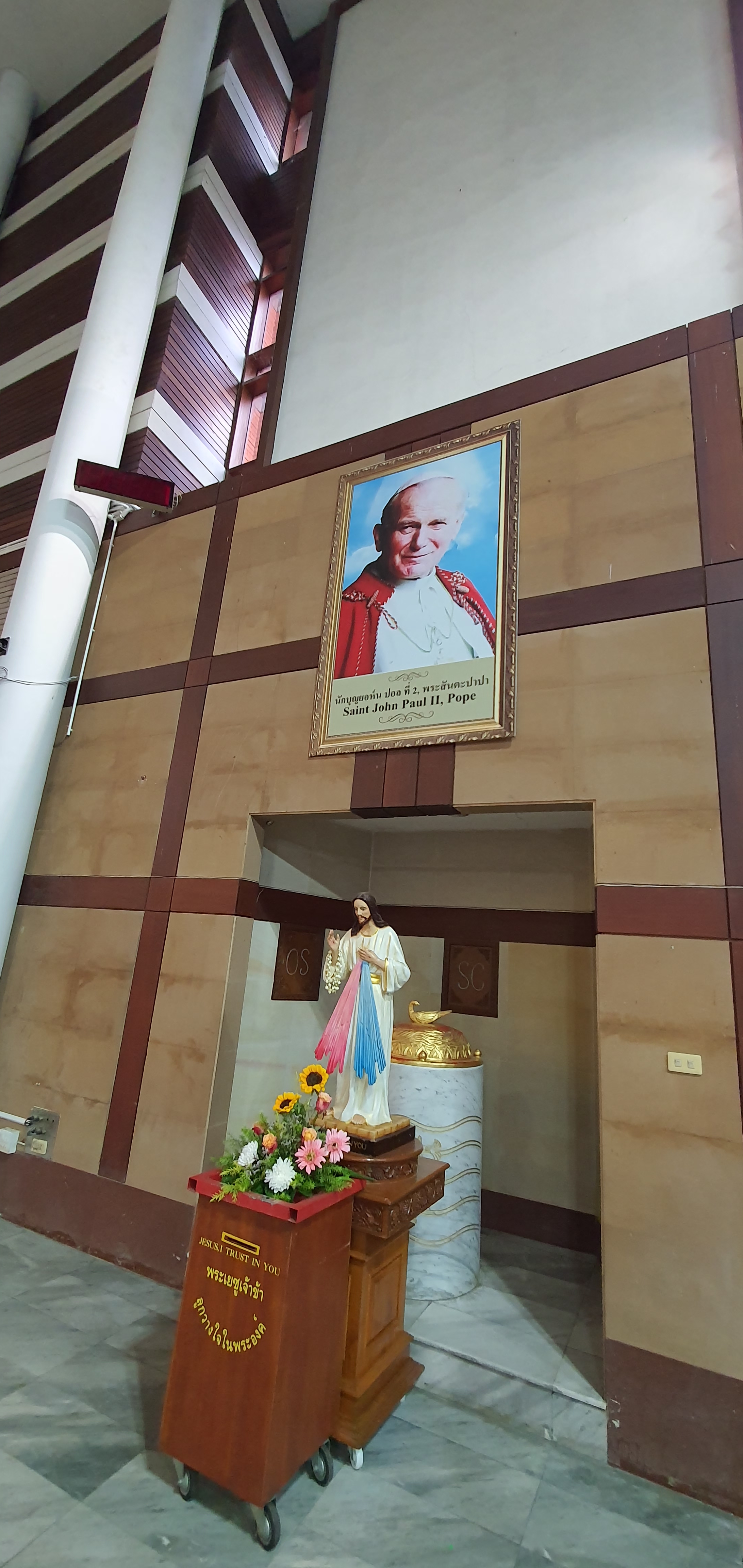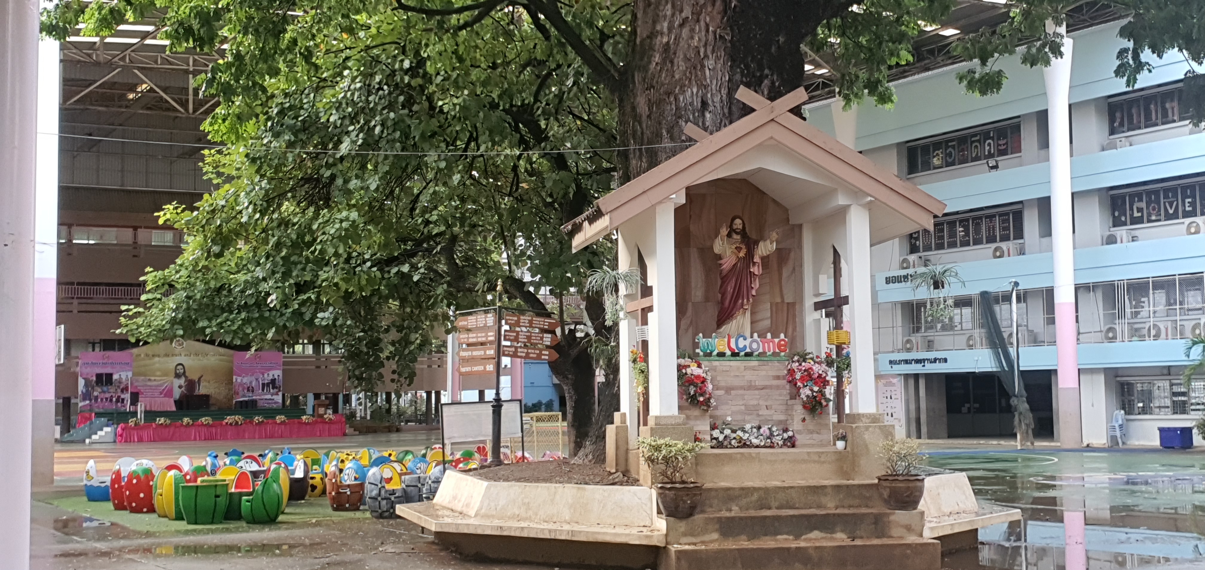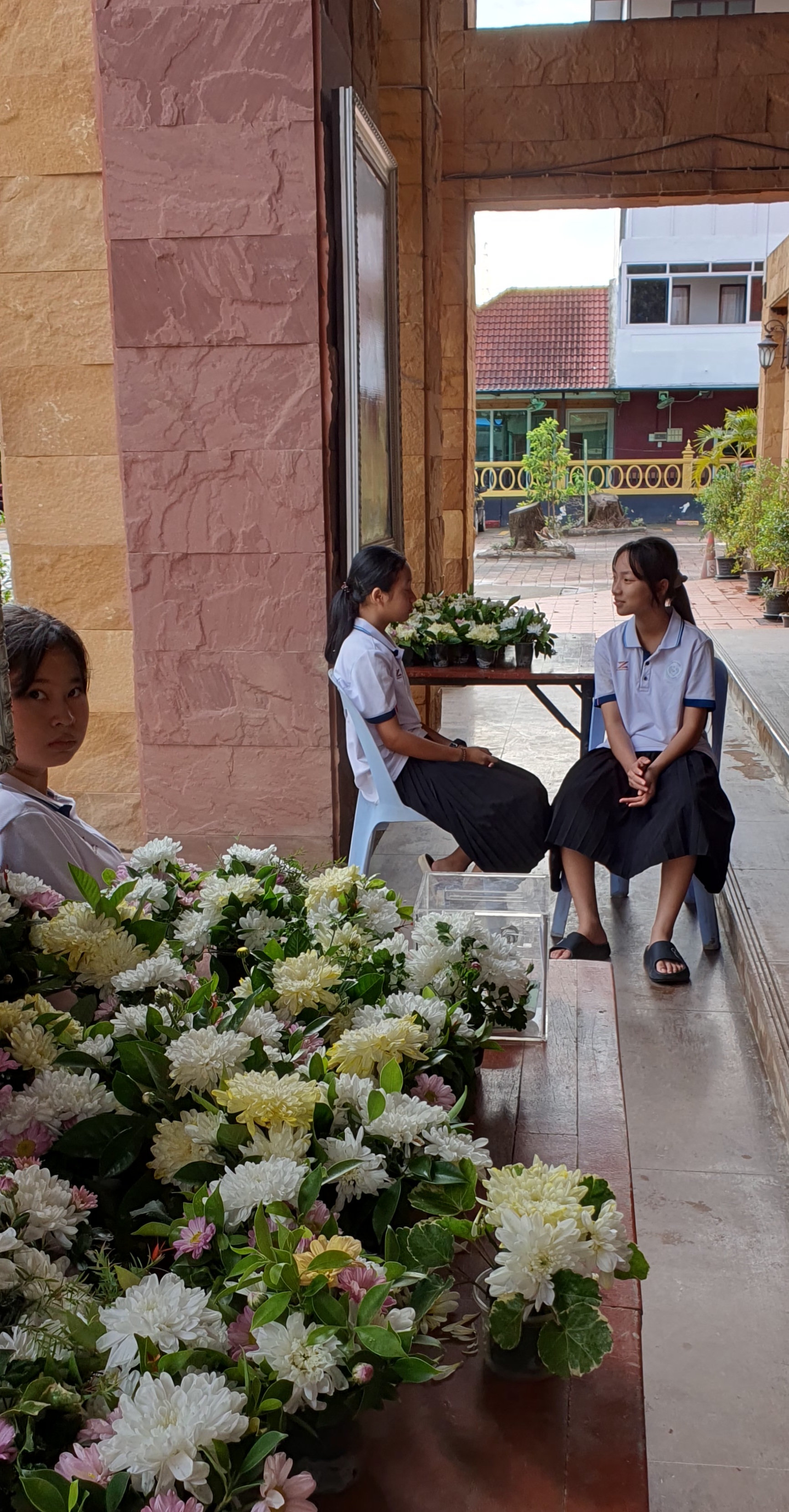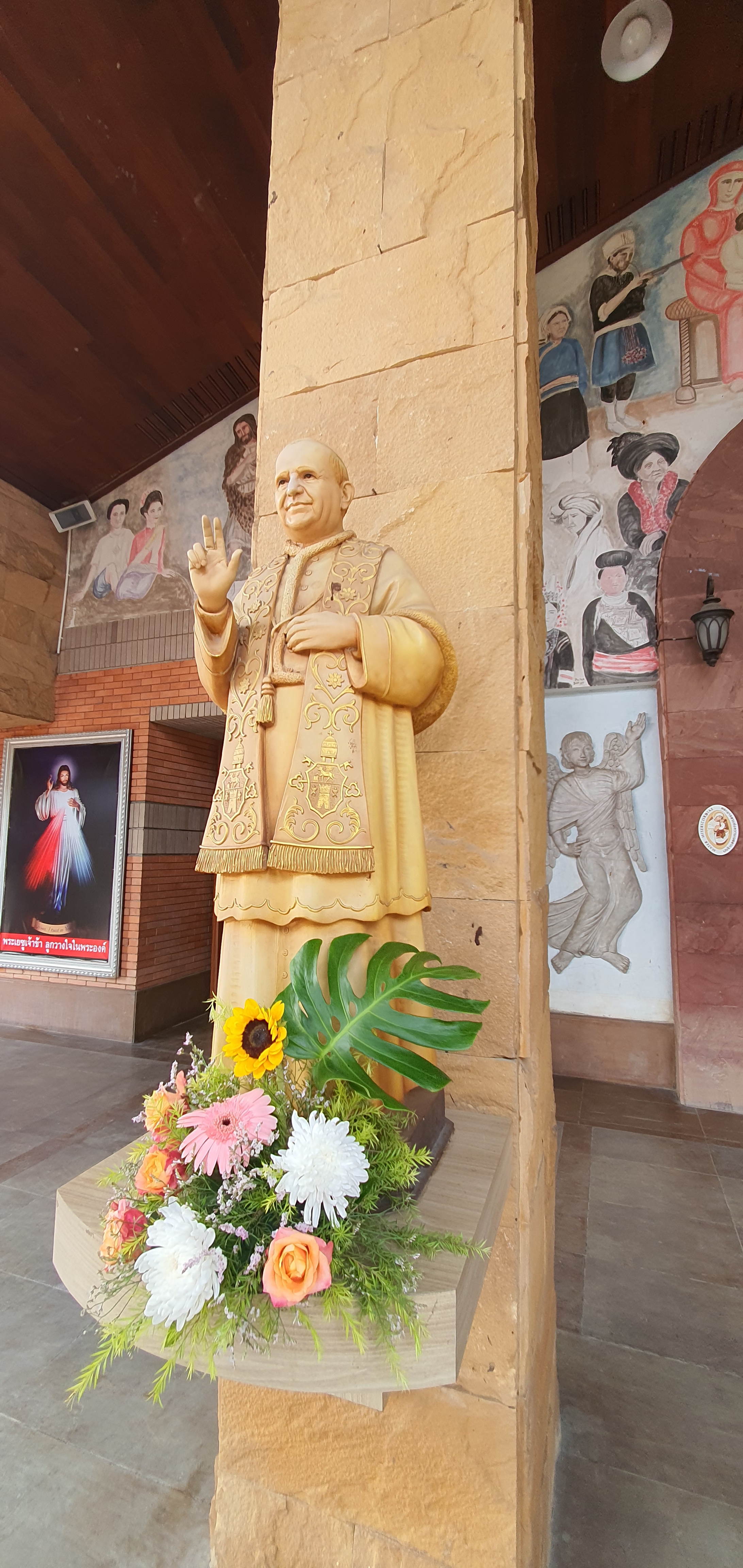 성당입구에서 학생들이 꽃을 팔고 있었다. 성모상에 헌화할 작은 꽃바구니, 20바트 지폐 하나를 기부통에 넣고 성모상에 바치고 기도하고 성당으로 들어간다. 기부금이 너무 작었나 싶어서 100바트 지폐를 한 장 더 넣고, 학생들을 위해서 마음 속으로 기도했다.