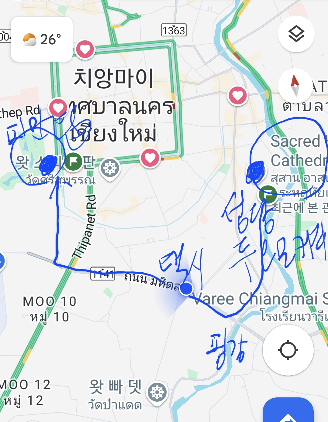 성당에서 피만팁으로....큰 길로 돌아서 가고 있었다. 치앙마이와서 첫날 거처했던 호텔 근처, 센트럴 에어포트 프라자 옆 고가를 지나고 있다. 그나저나 95바트로 불렀으니 이 길이 맞겠지라며 GLN으로 지불할 것을 준비했다. 도착해서 GLN으로 스캔하려 했는데 두번 실패했다. 100바트 지폐를 드리고 5바트는 팁이라며, 거스럼돈을 사양했다. 땡큐라는 말에 카쿤캅으로 응대했다.