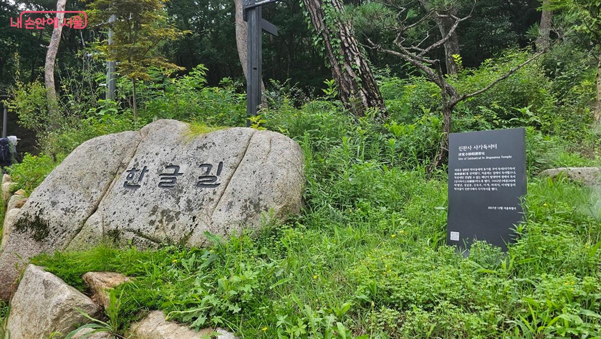훈민정음 창제와 관련된 숨은 장소는 은평구에도 있다. 은평한옥마을 인근 진관사의 일주문과 극락교를 지나 왼편 응봉능선 등산로로 향하면 초입에 ‘한글길’이란 커다란 바위 표석이 있다. 그 옆에는 훈민정음 제자 조형물이 설치되어 한글길이 된 사연을 말해 준다.