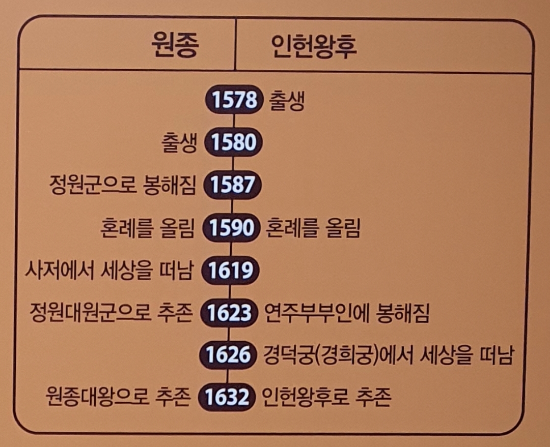 원종(元宗, 1580~1619)은 조선 제14대 왕 선조宣祖(재위 1567~1608)와 인빈 김씨 사이에서 태어났으며 본명은 이부李坪다. 8세에 정원군에 봉해졌고, 11세에 구사맹의 딸과 혼인하여 아들 셋을 뒀다. 임진왜란 중 아버지 선조를 모신 공으로 호성공신에 봉해졌다. 막내 능창군이 역모에 연루돼 사망하자 큰 충격을 받고 술을 많이 마시다 병들어 40세에 세상을 떠났다. 후일에 장남 인조가 반정 (1623)에 성공해 즉위하면서 정원군은 '원종', 그의 비는 '인헌왕후(仁獻王后, 1578~1626)로 추존(1632) 되었다.