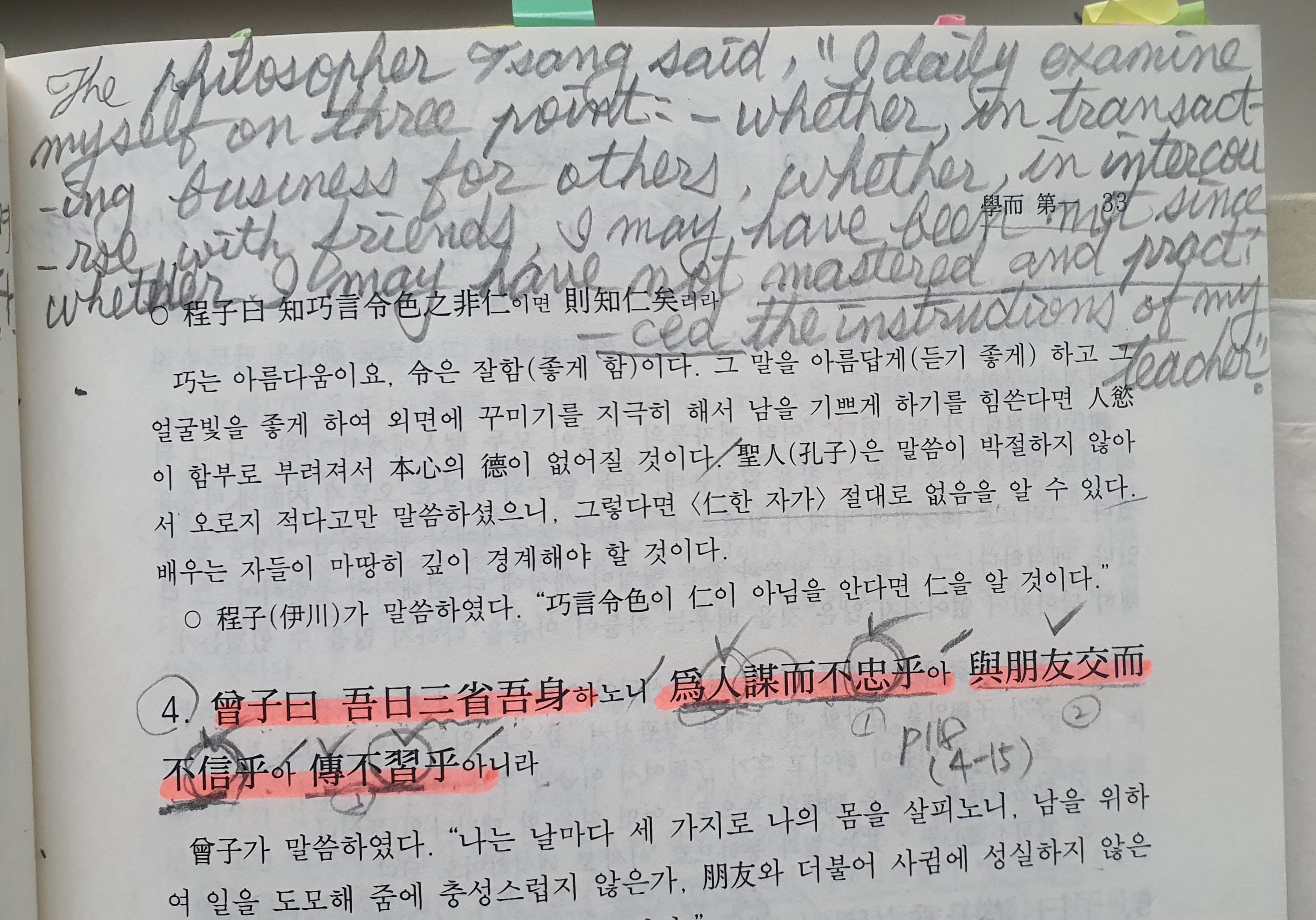 그러고 그 200여 명구를 <논어집주> 책에 연필로 영문 필사하기를 이제서야 마쳤다.