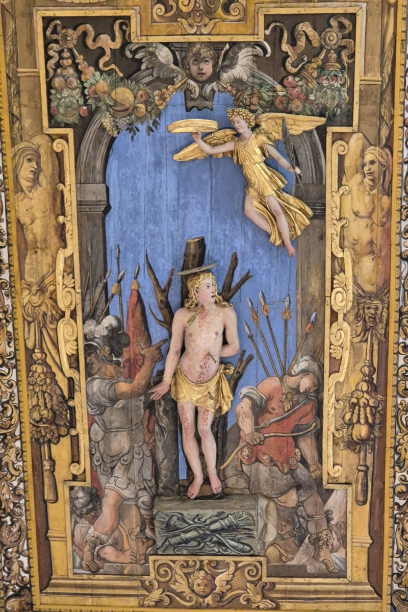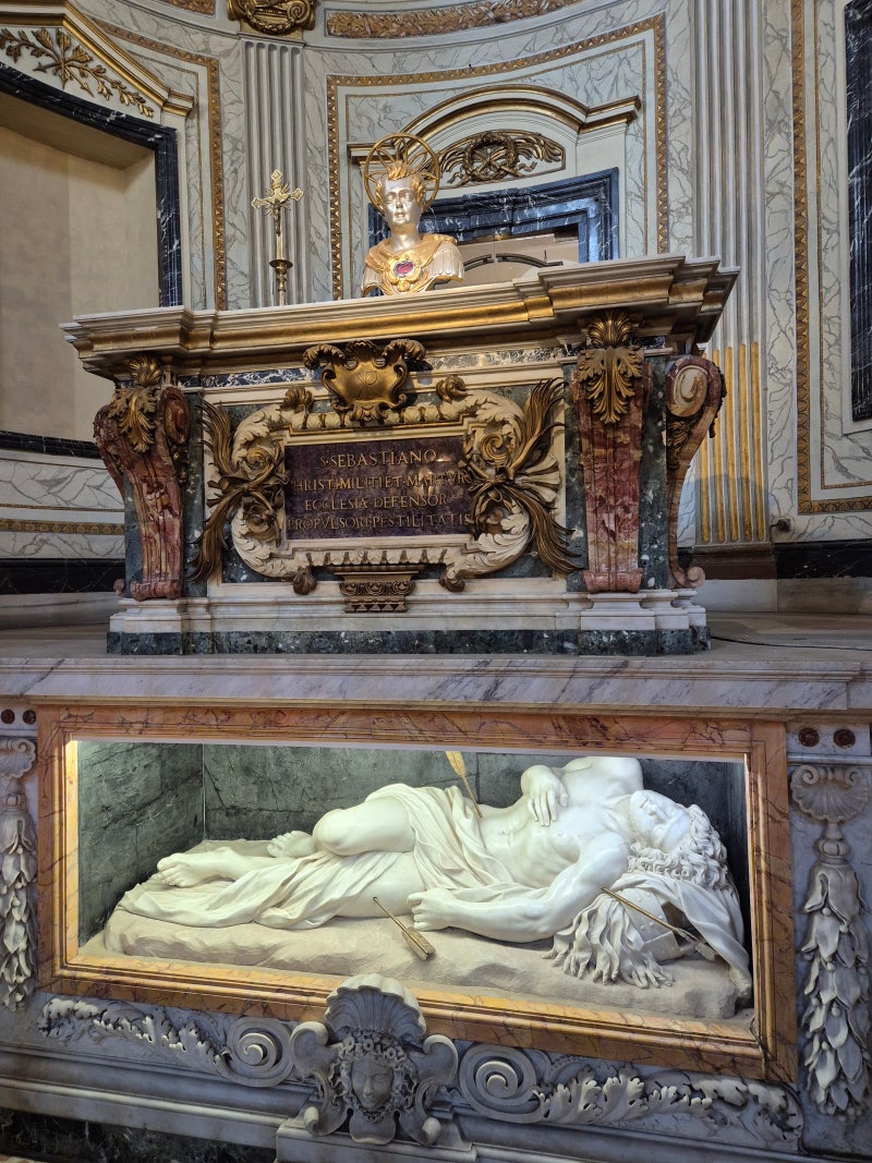 프랑스 남부 나르본에서 태어난 성 세바스티아노는 로마에서 군대에 입대하였고, 디오클레티아누스 황제의 신임을 얻어 친위대의 지휘관에 오르지만, 황제의 포악한 박해에 맞서 당당히 자신이 그리스도인임을 고백하였습니다. 황제는 그를 궁수들에게 넘겨 사형에 처했으나, 온몸에 화살을 맞고 쓰러진 성인의 시신을 이레네라는 부인이 찾으러 가서, 살펴보니 아직 살아있음을 확인하고 극진히 간호하여 기적적으로 회생시켰습니다. 다시 황제 앞에 나타난 성인을 보고 경악한 황제는 이번에는 몽둥이로 때려 죽인 다음 하수구에 던져 버렸습니다. 순교한 후에 성인은 루치나의 꿈에 나타나 자신의 시신을 찾아 공동묘지에 매장해 달라고 부탁하였습니다. 이 공동묘지는 사도 베드로와 바오로의 유해를 258년부터 옮겨 온 장소였고, 이러한 이유로 4세기 초반에 콘스탄티누스 황제는 이 특별한 장소에 '사도들의 대성당(Basilica Apostolorum)'을 세웠습니다. 367년에 대성당은 교황 성 다마소 1세에 의해 성 세바스티아노의 이름으로 봉헌되었는데, 교회는 군인과 궁수, 그리고 전염병의 수호성인을 공경하며 그의 순교일인 1월 20일을 그의 축일로 지냅니다. 17세기에 이르러 교황 대성당의 명의 사제였던 보르게세 가문의 쉬피오네 추기경의 후원으로 플라미니오 폰치오가 설계를 맡아 1613년에 새롭게 완성되었습니다. 원래 2열 3랑의 바실리카 양식을 하나의 신랑(身廊)을 가진 바로크 양식으로 개축한 성전에 들어서면 베르니니의 유작으로 알려진 '세상의 구세주(Salvator Mundi)'를 만나볼 수 있습니다. 성인을 관통했던 화살, 성인을 묶었던 기둥, 그리고 '주님, 어디로 가십니까? (Domine, Quo vadis?)' 사건과 관련된 예수님의 발자국이 새겨진 돌바닥 등이 보존된 성유물 경당이 있으며, 지하 카타콤베에 안치된 성인의 무덤과 수직으로 일치하는 위치에 세워진 성 세바스티 아노 경당에 있는, 화살을 맞고 누워있는 성인의 조각상을 바라보며 순교의 의미를 되새겨 볼 수 있습니다.