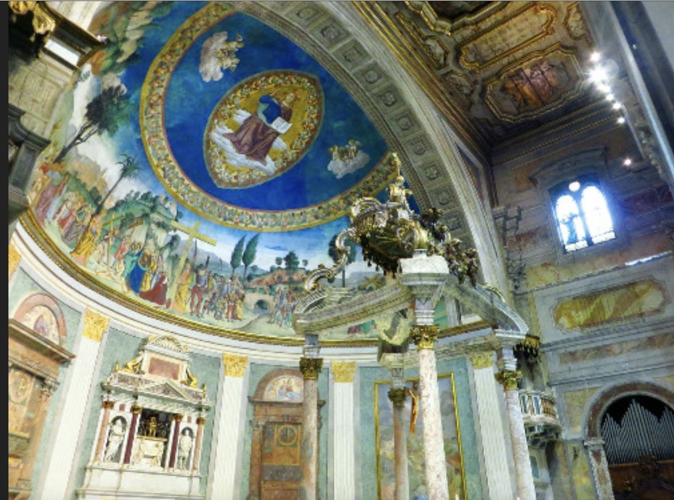 성전 후진부에서는 안토니아쪼 로마노가 그린 프레스코화를 통해 헬레나 성녀가 십자가를 발견하는 장면을 자세히 볼 수 있고, 중앙 제대를 바라보며 왼쪽 통로를 따라 만나게 되는 성유물 경당에는 십자가의 나무 조각, 가시 면류관, 못, 십자가의 명패, 우도(착한 강도)의 십자가 횡목, 그리고 사도 토마스의 손가락 등이 보존되어 있어 순례자들이 그리스도의 수난과 부활을 직접 마주하도록 초대하고 있습니다.