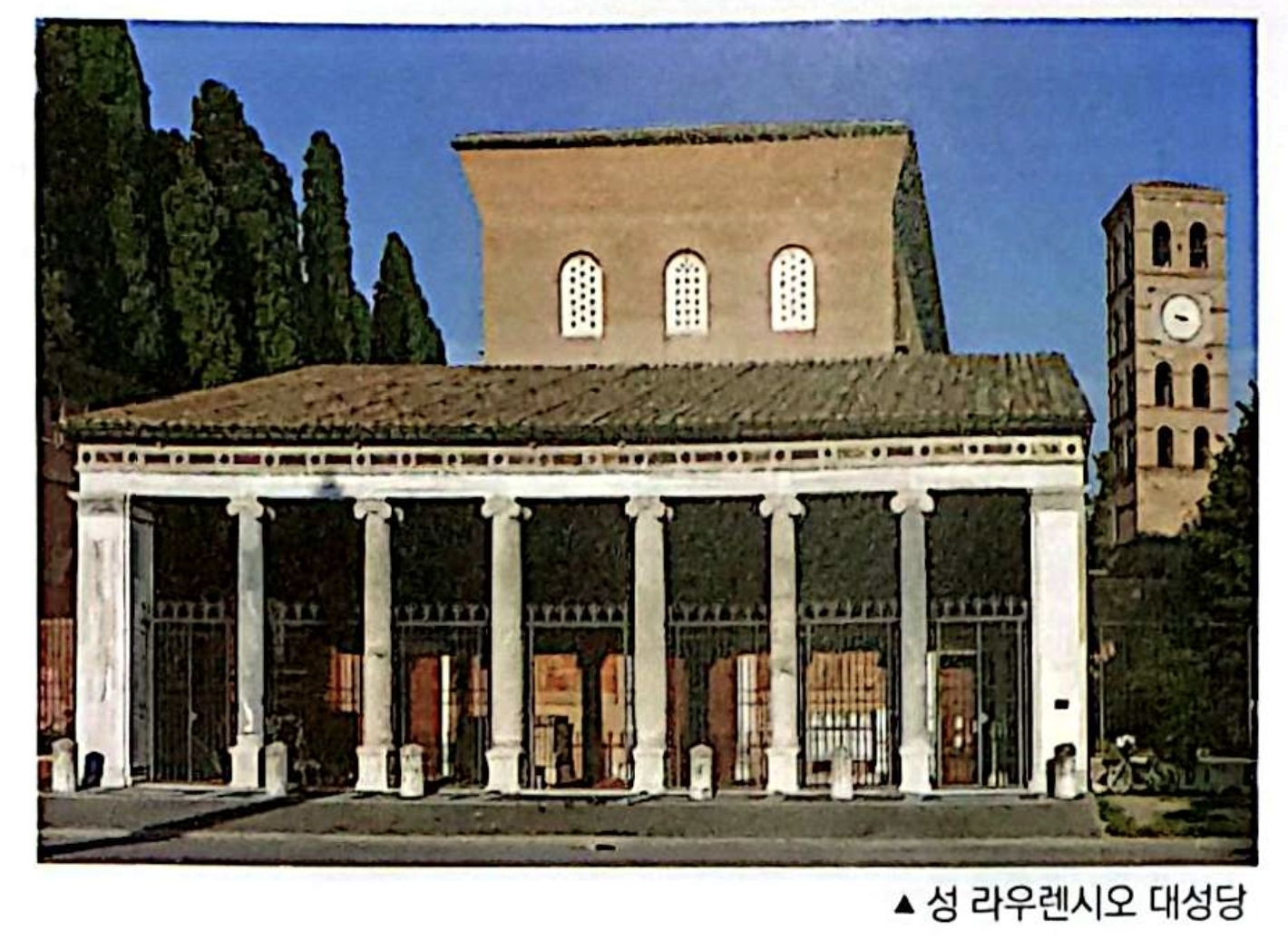성벽 밖의 성 로렌조 대성당(Basilica di San Lorenzo fuori le Mura)은 동쪽으로 뻗어 나가는 티부르티나 가도(Via Tiburtina)를 따라 자리한 성 로렌조(라우렌시오)의 무덤 위에 세워졌습니다. 스페인 북부 우에스카에서 태어난 성 로렌조는 로마에 와서 교황 시스토 2세의 수석 부제를 지내던 중, 발레리아누스 황제의 박해로 인해 258년에 순교하였습니다. 카타콤베에서 미사를 봉헌하던 시스토 2세가 동료 부제들과 함께 순교 당할 때, 로마의 집정관은 로렌조를 살려두고 교회의 모든 보물을 즉시 황제에게 바치라고 엄명을 내렸습니다.