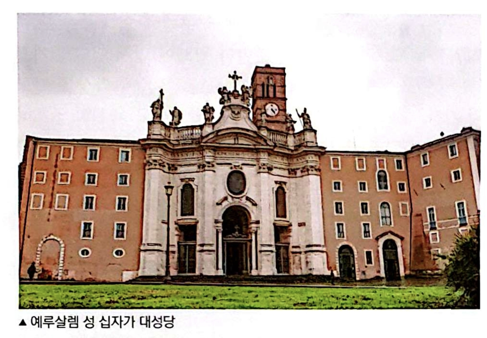 예루살렘 성 십자가 대성당(Basilica di Santa Croce in Gerusalemme)은 콘스탄티누스 황제의 어머니인 헬레나 성녀가 예루살렘 순례 중 발견한 성유물들을 로마로 가져오면서 황제 별장인 세쏘리움(Sessorium) 궁전 일부를 개조해 이 유물들을 보존할 성당으로 봉헌하였고, 그 기초에는 실제 예루살렘에서 가져온 흙을 덮어 이곳이 곧 '로마 안의 예루살렘'이 되게 하였습니다. 2열 3랑의 바실리카 양식으로 지어진 성당은 1743년에 교황 베네딕토 14세의 후원으로 바로크 양식의 화려한 정면부와 타원형 현관이 더해져 오늘날의 우아한 모습을 갖추게 됩니다.
