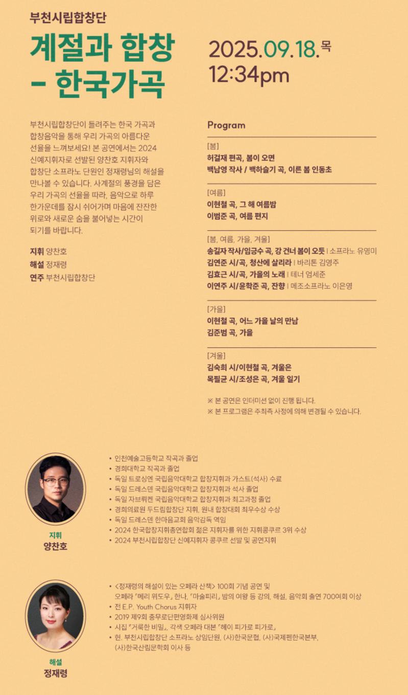 사계절의 풍경을 담은 우리 가곡의 선율을 따라, 음악으로 하루 한가운데를 잠시 쉬어가며 마음에 잔잔한 위로와 새로운 숨을 불어넣는 시간이 되기를 바랍니다.