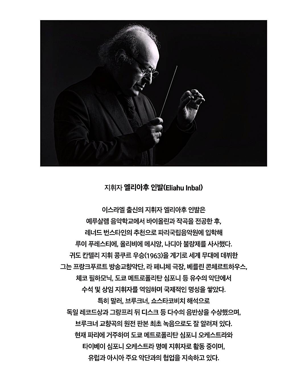 말러와 브루크너 해석의 권위자, 이스라엘 출신의 세계적 거장 엘리아후 인발의 지휘와 한국의 대표 피아니스트 백건우의 협연.