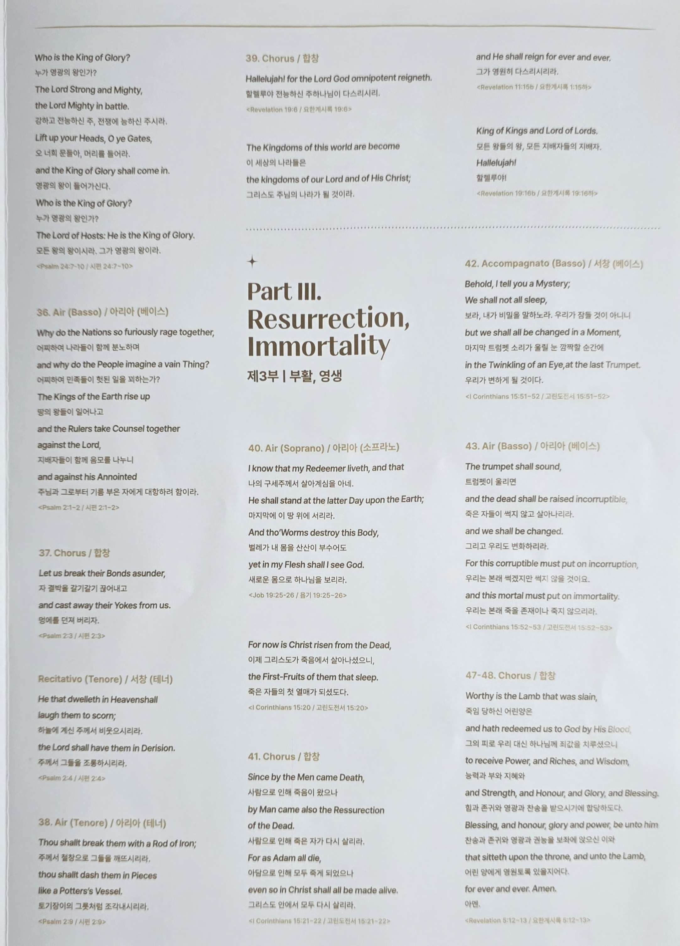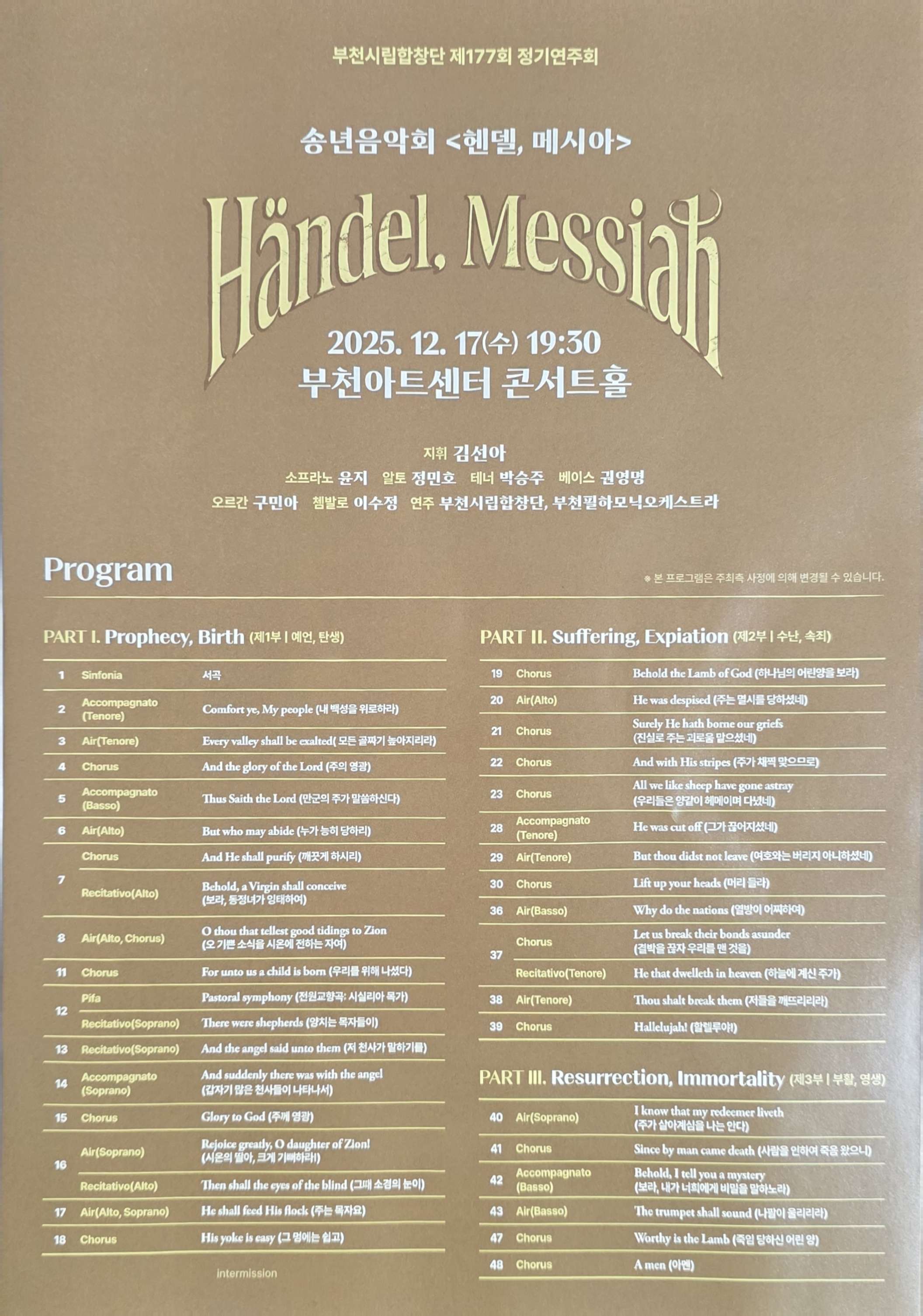 ㆍ매곡마다 박수치지 마시고, 3부로 구성된 <메시아>의 1부가 끝나면 박수를 보내주시고 휴식시간을 갖고 2, 3부가 모두 끝나면 박수를 부탁드린다.