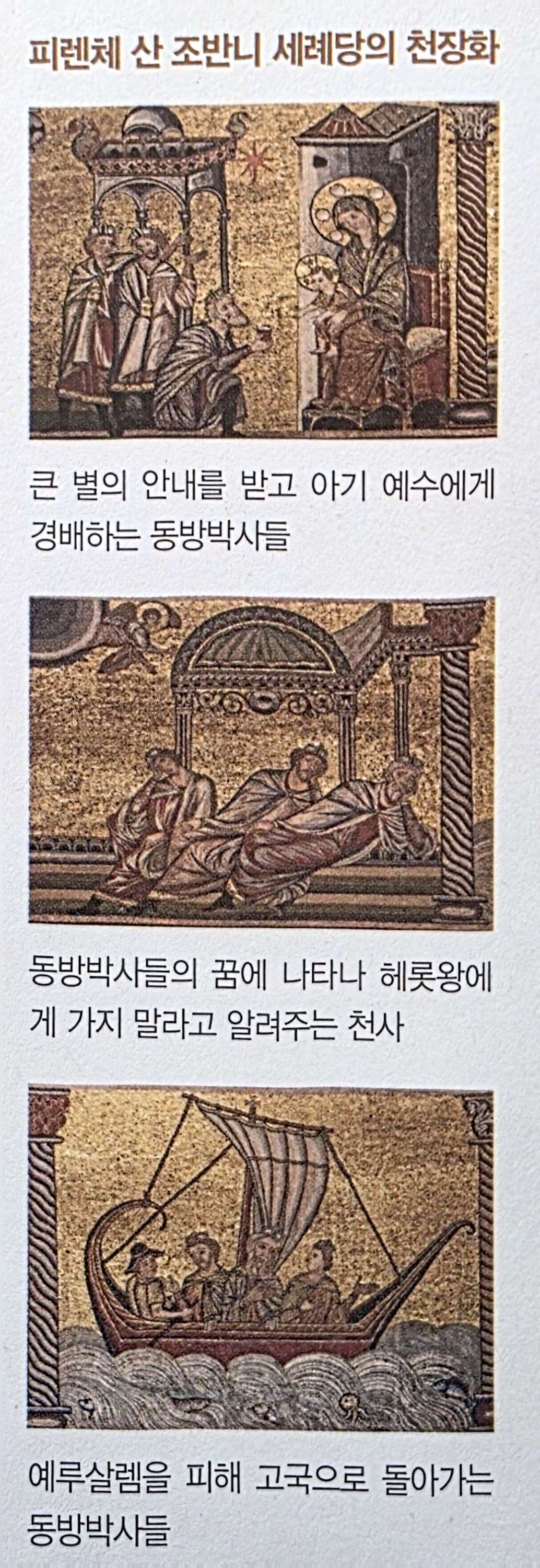 동방박사들이 예수에게 경배드린 후, 헤롯왕의 부탁을 들어주기 위해 예루살렘으로 가려 하자 꿈에 천사가 나타나 그들을 만류했고, 동방박사들은 천사가 알려준 다른 길로 고향으로 돌아갔다고 하는데, 피렌체 산 조반니 세례당의 천장화에 그 내용이 구체적으로 표현되어 있습니다.