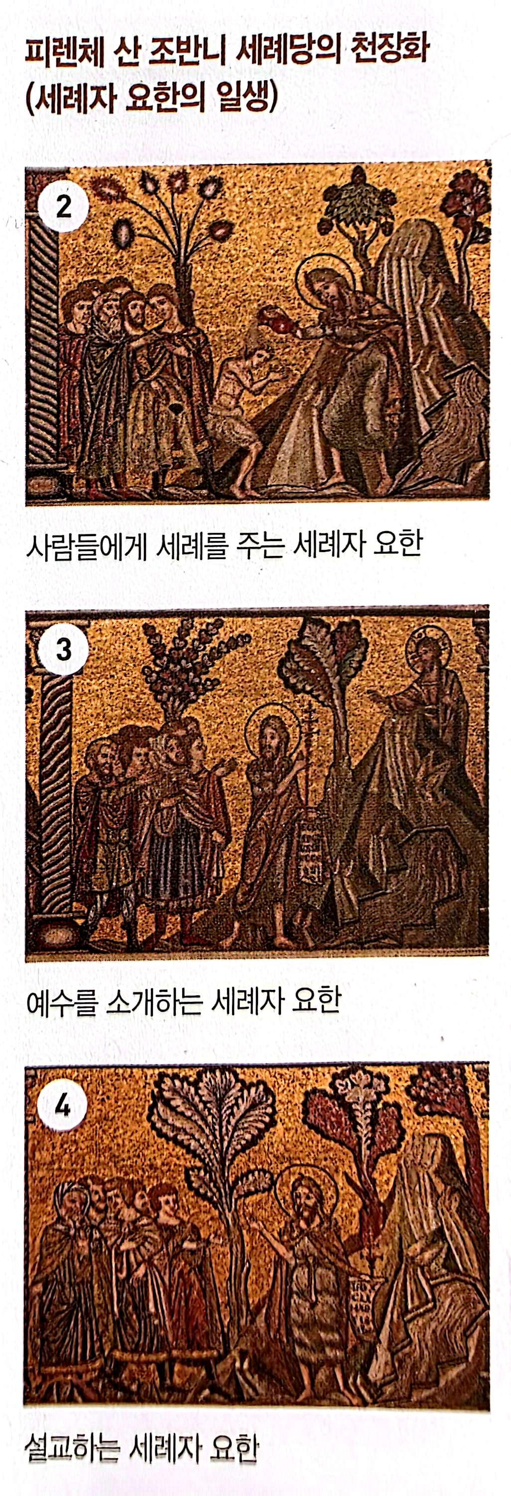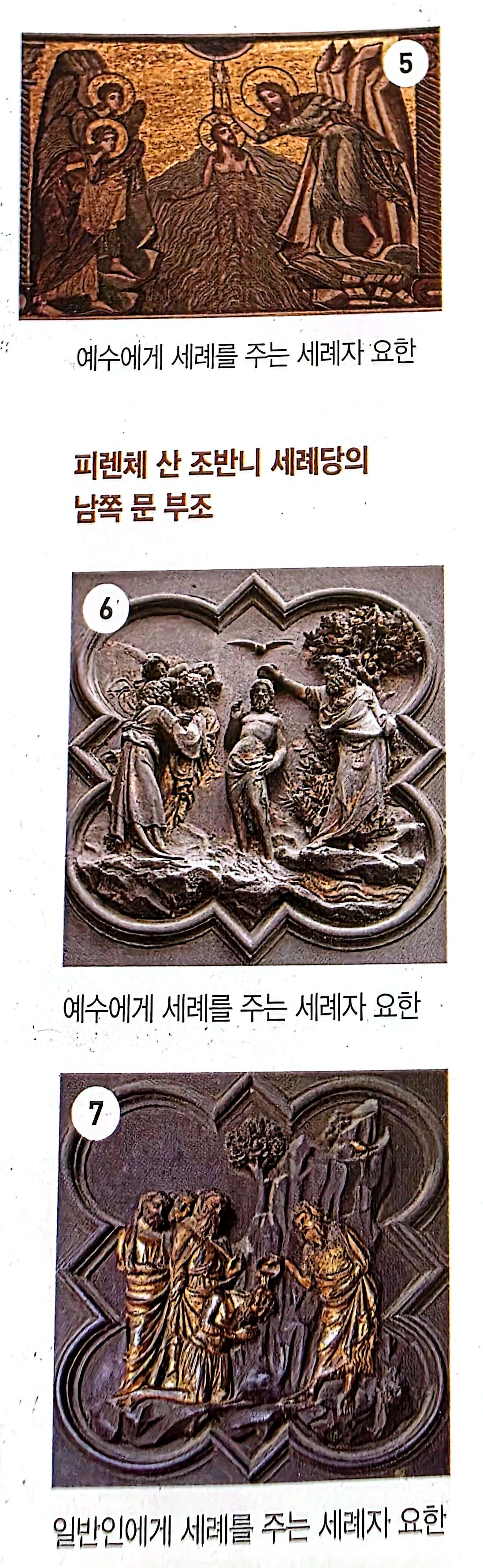 참고로, 세례자 요한이 세례를 주는 장면을 볼 때 세례를 받는 이가 예수인지 아니면 다른 사람인지를 구별하려면, 천사나 성부(하느님), 성령(비 둘기로 표현)이 함께 표현되는지를 살펴보면 됩니다. '예수의 세례'의 경우 대부분 성부나 성령, 혹은 천사가 함께 표현되지만, 일반인의 세례에는 전혀 보이지 않습니다. 세례를 받는 사람들의 무리와 세례자 요한만이 보일 뿐이지요. 결국 예수의 세례인지 아닌지는, 천사와 성부, 성령의 유무로 판단하면 대체로 맞을 것입니다.