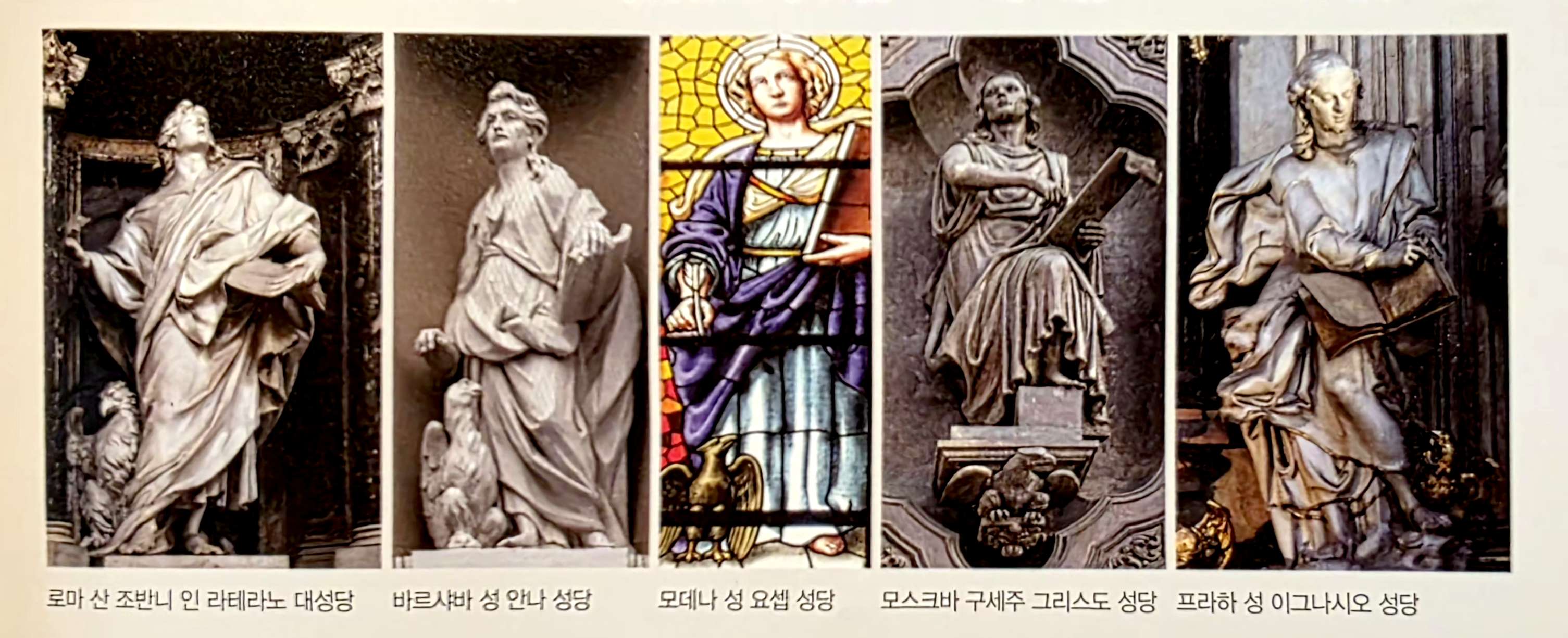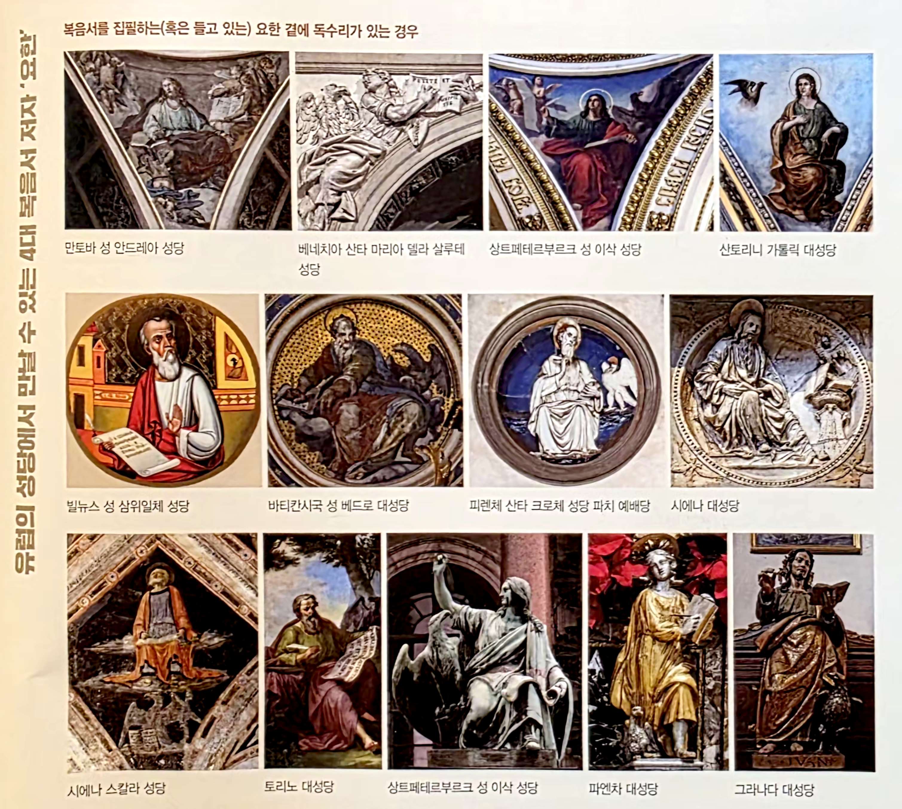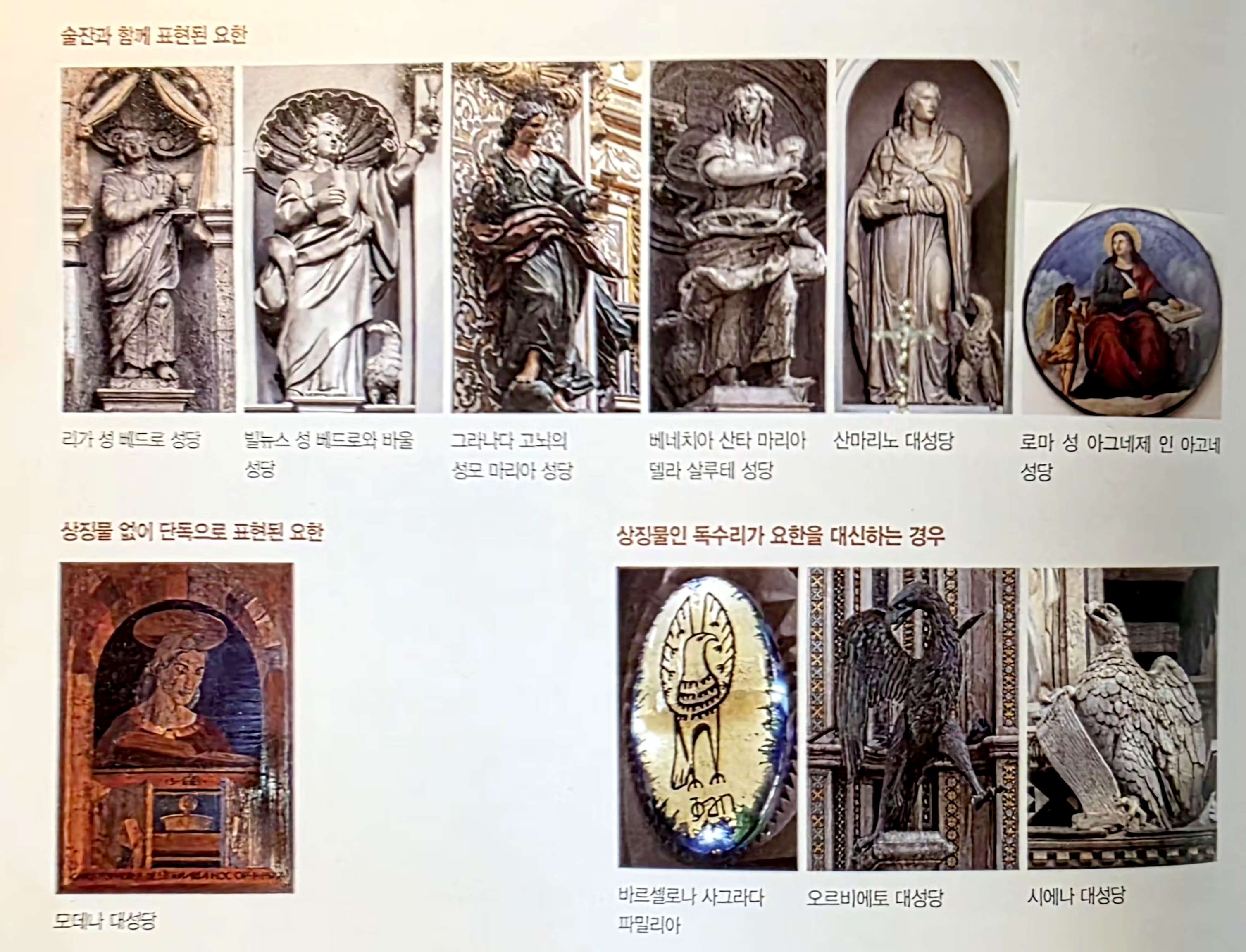 요한은 열두 제자 중 한 사람이면서 4대 복음서 저자 중의 한 사람이기도 하므로, 유럽의 성당에서 누구보다도 더 많이 볼 수 있습니다. 그의 상징이 독수리와 술잔인 점을 기억한다면 쉽게 알아볼 수 있을 것입니다. 물론 다른 복음서 저자들의 경우처럼 상징물 없이 단독으로 표현되는 경우, 상징물로만 표현되는 경우도 있습니다.