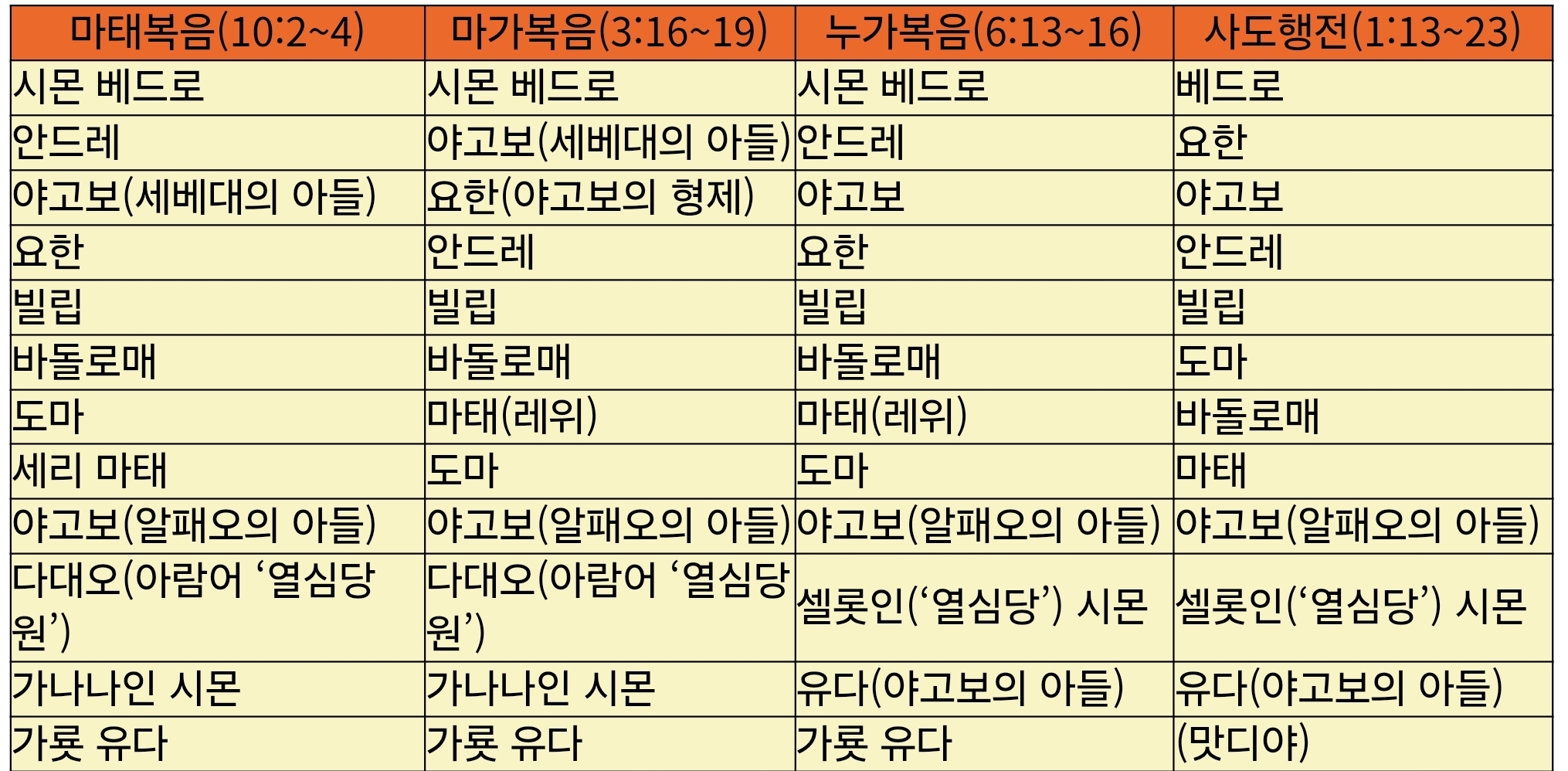 일반적인 서순(마르코복음 3:16-19, 마태오복음 4:18-22, 10:1-4)으로는