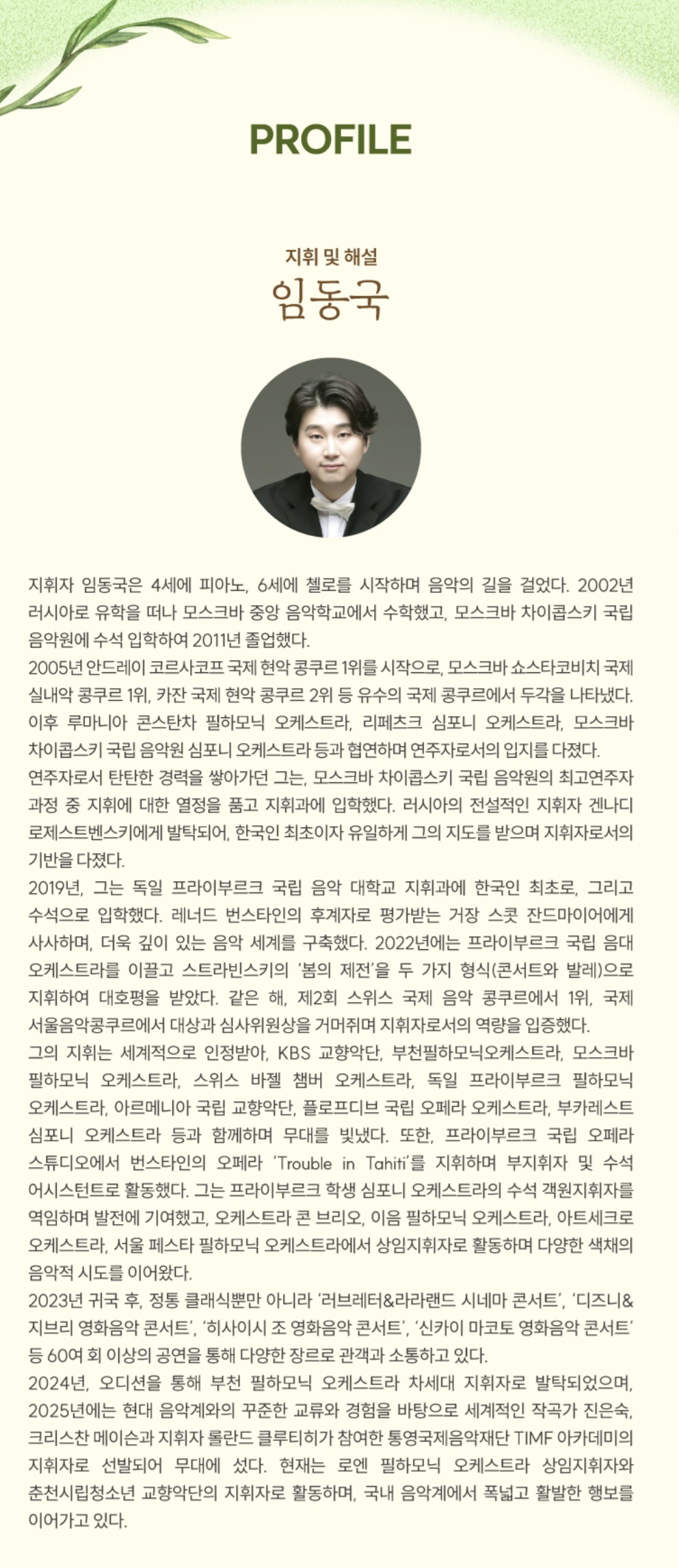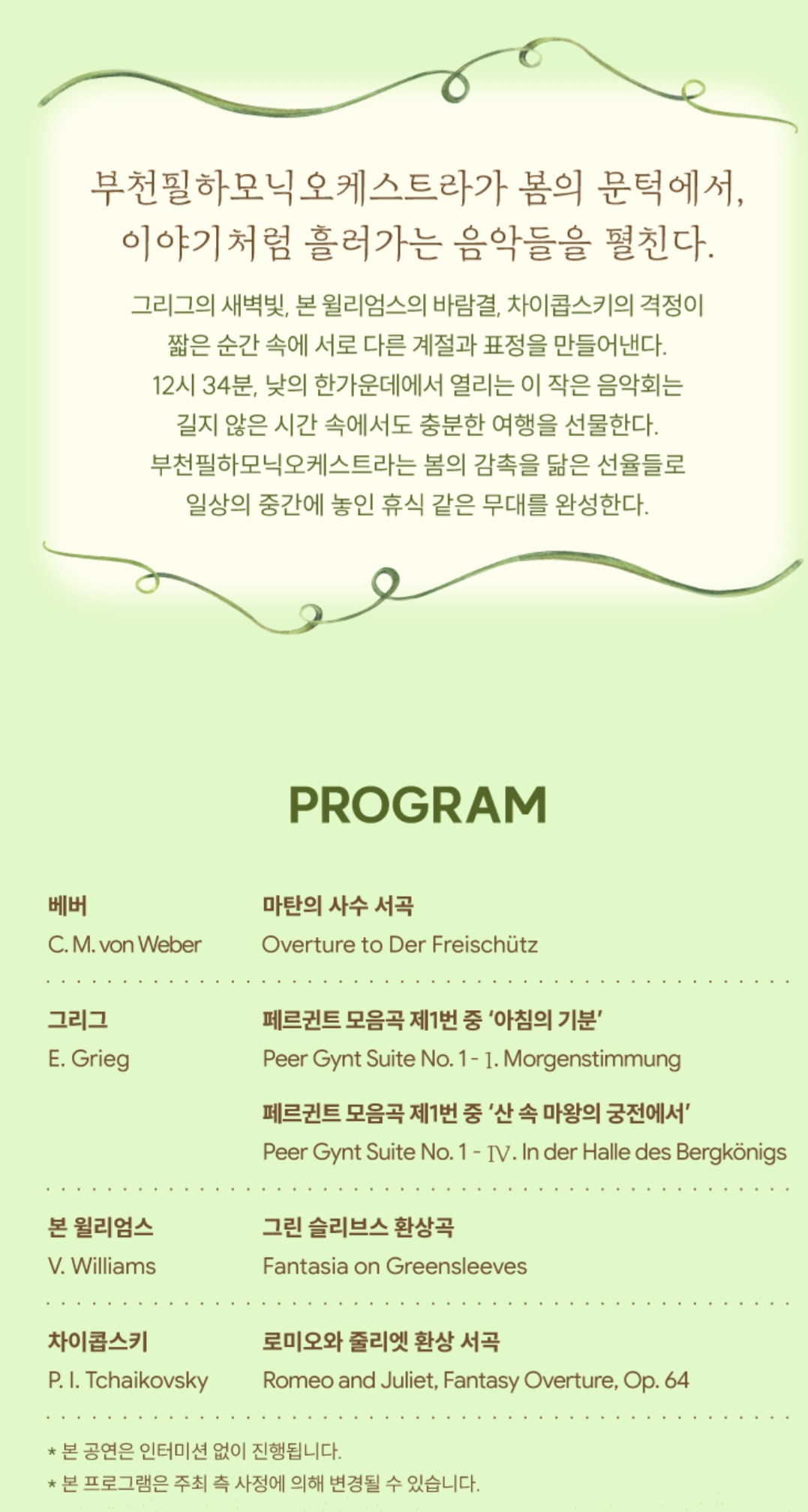 그리그의 새벽빛, 본 윌리엄스의 바람결, 차이콥스키의 격정이 짧은 순간 속에 서로 다른 계절과 표정을 만들어낸다. 12시 34분, 낮의 한가운데에서 열리는 이 작은 음악회는 길지 않은 시간 속에서도 충분한 여행을 선물한다. 부천필하모닉오케스트라는 봄의 감촉을 닮은 선율들로 일상의 중간에 놓인 휴식 같은 무대를 완성한다.