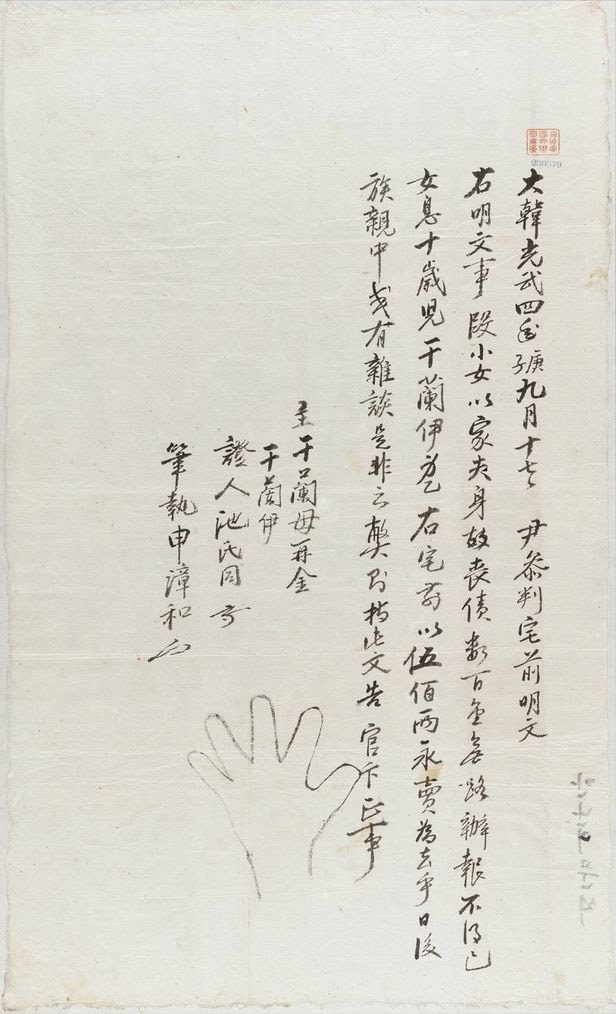 최씨 성을 가진 여자가 열 살짜리 자기 딸 간난이를 노비로 팔겠다고 내놓았다. ‘긴급히 사용하기 위해(緊用次·긴용차)’라 적어놓았으니 급전이 필요했던 듯하다. 그녀가 딸에게 매긴 몸값은 362냥 53전이었으니, 이게 빚 규모가 아니었을까. 문서에는 최씨 손바닥만 그려져 있을 뿐 간난이를 사간 사람도 증인도 없다. 거래 불발. 최씨가 간난이를 내놓은 때는 망국 1년 전인 대한제국 융희 3년, 1909년 음력 11월 한겨울이었다. (규장각한국학연구원 문서번호 86981)