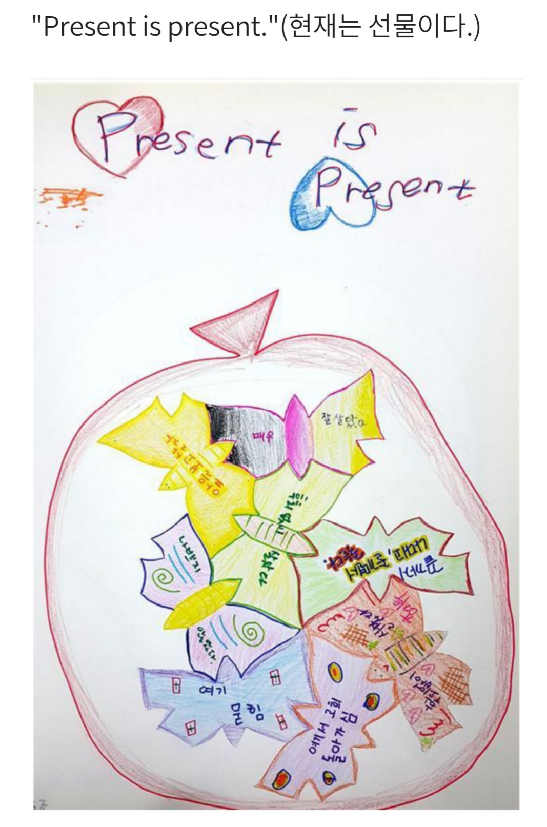 아이들을 가르치면서, 아이들이 도리어 나를 가르친다는 것을 알게 된다. 각자가 자신의 묘비명을 작성하고 쪽매에 새겨 모둠 친구들과 쪽매맞춤(테셀레이션)을 한 다음에, 함께 디자인하고 일언명구로 그 의미를 붙여 보았다. 한 모둠 아이들이 나에게 '걸작'을 보여주었다. 나와 아이들에게 정말 소중한 선물이 되었다. 아이들에게서 크게 배웠다.