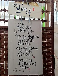 캘리그래피24 캘리그래피 삶과 행복 "캘리그래피는 위로이며 선물이며 행복이다." 아이들과 함께하는 행복한 공부, 길과 시와 노래와 그림과 예쁜 손글씨. 아주 가까운 삶 속에 있었답니다. 그저깨, 용인 수지 신봉천을 걷다가 커피 향에 끌려 카페 들어갔습니다. 카페 이름 "또나랑커피". 그 이름도 매력적이네요. 또 나(and me)? 내 속의 나인지, 또 다른 나(another me)인지, 친구를 가리키는 第二吾(second me)인지? 그러다가 그냥 영문 캘리에 끌려 볶은 커피콩도 사게 되었습니다. 아침에 핸드 드립한 커피를 마시며, 나와 함께 살아가는 캘리그래피에 새삼 행복해합니다. 그러고보니 내 주변에 아름다운 손 글씨가 참 많네요. 선물받은 오늘, 나날이 감사한 삶입니다. "Kenya AA" ~ 3/3에 볶음 정성껏 볶은 커피콩을 봉투.. 2021. 3. 6. 엄마의 명언 아침 식탁, 팬케이크와 커피가 차려졌습니다. 뭔가 부족한 듯 느껴서, "메이플시럽 뿌려 먹으면 더 맛있겠다"라 했더니, 순발력있게 아내가 응대를 합니다. "없는 거 찾지마라. 엄마의 명언" ~ 엄마의 명언? 그 순간 돌아가신 엄마 생각이 울컥 밀려오면서, 엄마가 하신 여러 명언들을 떠올렸습니다. 그때는 몰랐는데, 지금 생각해보면 현자의 말씀이 따로 없었습니다. "니 지금 쬐는 불이 따시단다."는 그 말씀은 '지금보다 나은 그때없고, 여기보다 더 나은 거기는 없다.'는 말씀이셨습니다. 새삼, '엄마의 명언'을 형제들에게 물어 다시 듣고 싶어집니디.참 고마운 사람입니다. 낮에 아내가 장보러가서 메이플 시럽을 사가지고 왔답니다. 엄마의 빈자리를 안사람이 많이 메꾸어줍니다. 2018. 12. 18. 잠시 쉬어가도 괜찮아 "잠시 쉬어가도 괜찮아" 위로를 주는 참 고마운 말을 들었다. 내게 최면을 걸듯이 전해준다. 어느 날 퇴근길에 라디오에서 노래를 흘러나온다. "잠시 쉬어가도 괜찮아"라는 노랫말이 귀에 들렸다. 그래, 쉬어가면서 가자. 천천히 함께 가자. 스스로에게 전하며 달래본다. ᆞᆞᆞ ㅡ 서영은 ᆞᆞᆞ 꿈을 꾼다 잠시 힘겨운 날도 있겠지만 한 걸음 한 걸음 내일을 향해 나는 꿈을 꾼다 혹시 너무 힘이 들면 잠시 쉬어가도 괜찮아 천천히 함께 갈 수 있다면 이미 충분하니까 자꾸 못나 보이는 나 맘에 들지 않는 오늘도 내일의 나를 숨 쉬게 하는 소중한 힘이 될 거야 꿈을 꾼다 잠시 힘겨운 날도 있겠지만 한 걸음 한 걸음 내일을 향해 나는 꿈을 꾼다. ᆞᆞhttps://youtu.be/GThSosVk3ZM 2018. 11. 12. 오늘도 좋은 날 되셔요. 노트북을 집에 두고 학교에 출근했어요. 덕분에 오늘도 좋은 날! 아이들의 시와 캘리그래피를 읽게 되었네요. 우리 아이들 문학시간과 인문학 산책길. 읽고 쓰고 그리고 자기 시를 짓기도 하였답니다. 그리고 아름다운 말 한구절, 따뜻한 말 한 마디를 캘리그래피로 남겨서 전시도 하구요. 연말에는 모든 친구들의 시가 담긴 시집도 출판되어서 같이 읽게 되었어요. 2학년 전체 아이들의 시집 서문은 두 분의 지도 선생님. 목차 참 고운 마음이죠? 예쁜 나윤이 2018. 10. 29. 성공이 아니라, 섬김입니다. 우리가 배워야 할 것은 성공이 아니라, 섬김입니다. Not Success, but Service. 2018. 6. 14. 가장 좋은 것은 물과 같다 - 상선약수(上善若水) 상선약수(上善若水) ~"가장 좋은 것은 물과 같다." (The highest excellence is like (that of) water.) 上善若水(상선약수) 지극히 착한 것은 마치 물과 같다. 水善利萬物而不爭(수선리만물이부쟁) 물은 만물을 이롭게 하면서도 다투지 아니하고 處衆人之所惡(처중인지소오) 모든 사람이 싫어하는 낮은 자리로 흘러간다. 故幾於道(고기어도) 그러하기에 도에 가깝다. ㅡ 노자, 8장 2018. 5. 12. 오유지족 ㅡ 지족불욕 지지불태 오유지족(吾唯知足) - "나 오직 만족을 알 뿐이다" "지족불욕, 지지불태" (만족을 알면 욕되지 않고, 그칠 줄 알면 위태롭지 않다.)ㅡ도덕경 작금의 세태를 보면 겸손할 줄 모르고 교만을 부리다가 패가망신하는 사람들. 절제할 줄 모르고 과욕을 부리다가 모든 것을 잃어버리는 사람들. "나, 왜 이럴 줄 몰랐나?" 하며 크게 후회하며 살아가는 사람들 많죠. 우리라도 이 말씀의 교훈을 새겨 살아갑시다. 행복, 뭐 별거 있나요? 만족을 아는 자가 부자랍니다. 2018. 5. 12. 드립커피의 맛, 캘리그래피의 멋 핸드드립 커피의 맛, 캘리그래피의 멋. 사용한 드립 필터지를 씻어 말렸다가 붓을 들어 글을 썼다. 지우개로 한글 아호를 서각하고 인주 찍어 낙관하니, 미인의 얼굴에 화장하고 연지 바른 듯 더 예쁘졌다. 'Cafe 보바리'는 판자조각, '나는 커피를 닮은..' 시는 종이 박스 조각. 버려지는 종이박스에서 끈을 떼어 묶어두니 내겐 이 세상에서 그 어디에도 없는 소중한 선물이 되었다. 내 방, 보바리 카페에서는 커피도 사랑이 되었다. 2018. 4. 11. 우리 아이들 캘리그래피 교육활동 선생님들 캘리그래피 동아리(다락캔디) 활동과 전시가 이제 학생동아리, 교과수업, 인성교육 등에도 파급되었다. ㅡ선생님 캘리 활동게시판과 학교 걸개그림, 협동조합매점 간판 등 ㅡ미술교과, 종이가방와 캘리 ㅡ 아이들 활동, 상담실에서 ㅡ아이들 활동, 안문학 산책과 시화 ㅡ 학생부 인성교육 프로그램 2017. 10. 25. 이전 1 2 3 다음