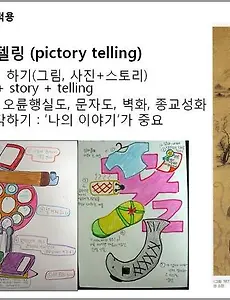 스토리텔링 수업, 어떻게 할까? 나의 스토리텔링 수업[인문교과] : 픽토리텔링 & 마이 스토리텔링 * 스토리텔링은 옛날부터 있어왔다. : 할머니의 이야기, 오륜행실도, 사찰의 벽화, 성당과 교회의 성화(icon), 판소리, 전설, 설화, 민담, 단군신화, 그리스로마 신화, 영웅담 * 픽토리텔링(pictory telling) : 그림이 있는 이야기 수업 [조선시대의 문자도 활용] * 마이 스토리텔링(my story telling) : ‘그의 이야기(his story = history․역사)’도 중요하지만 ‘나의 이야기(my story)’가 더 큰 의미가 있다. * 픽토리텔링 : 예> 조선의 효문자도 이야기 => 나의 효행실천 그림이야기 그리기 등..... * 마이 스토리 : 예> 생생상상 나의 꿈 이야기 ..